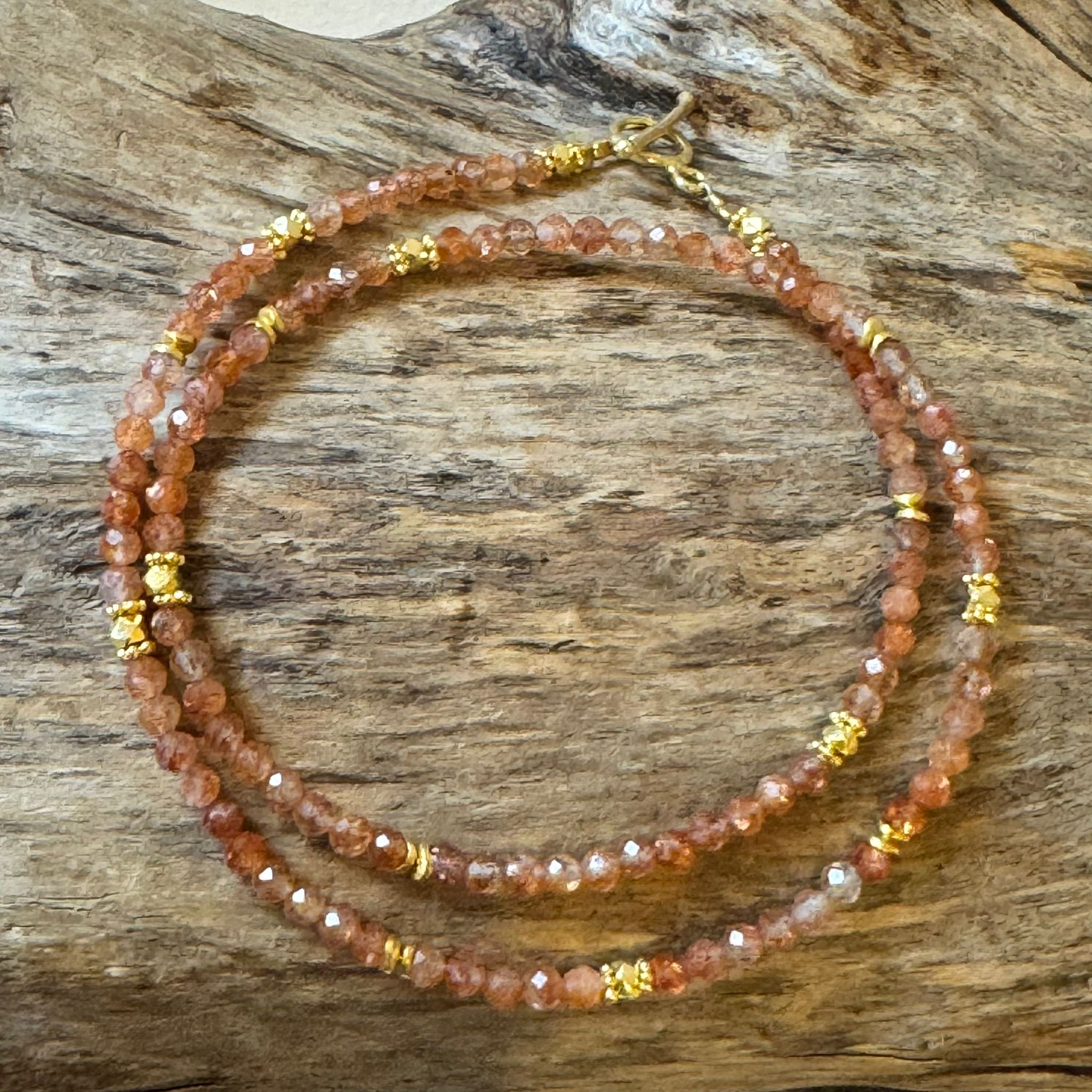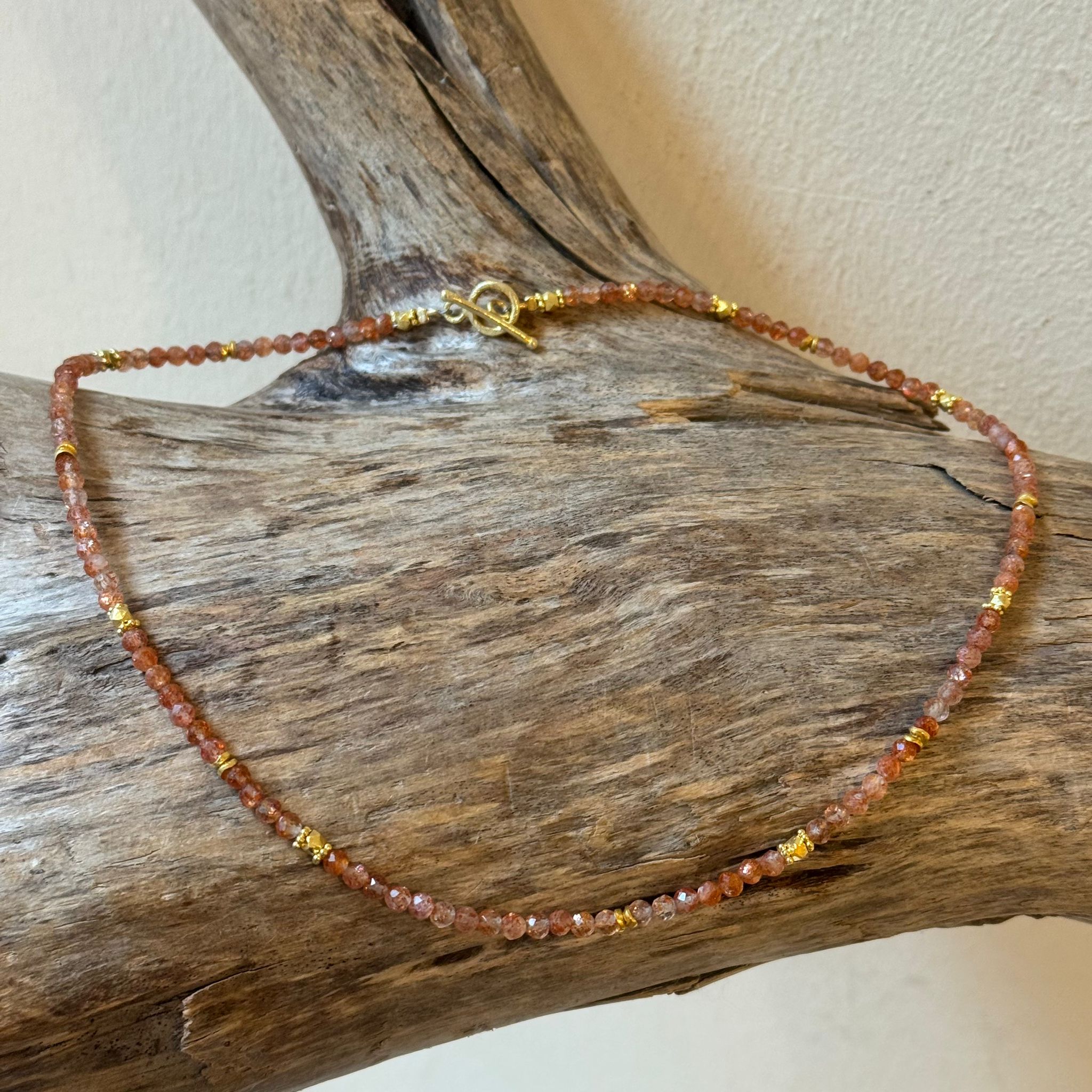 Diese schöne Kette haben wir aus sehr schön funkelndem Sonnenstein (3mm), Zwischenstücken aus vergoldetem Sterlingsilber und einem dekorativen Ring-Stab-Verschluss aus mattiertem vergoldetem Sterlingsilber kreiert. Die Kette hat eine Länge von 43,5cm.