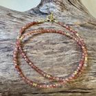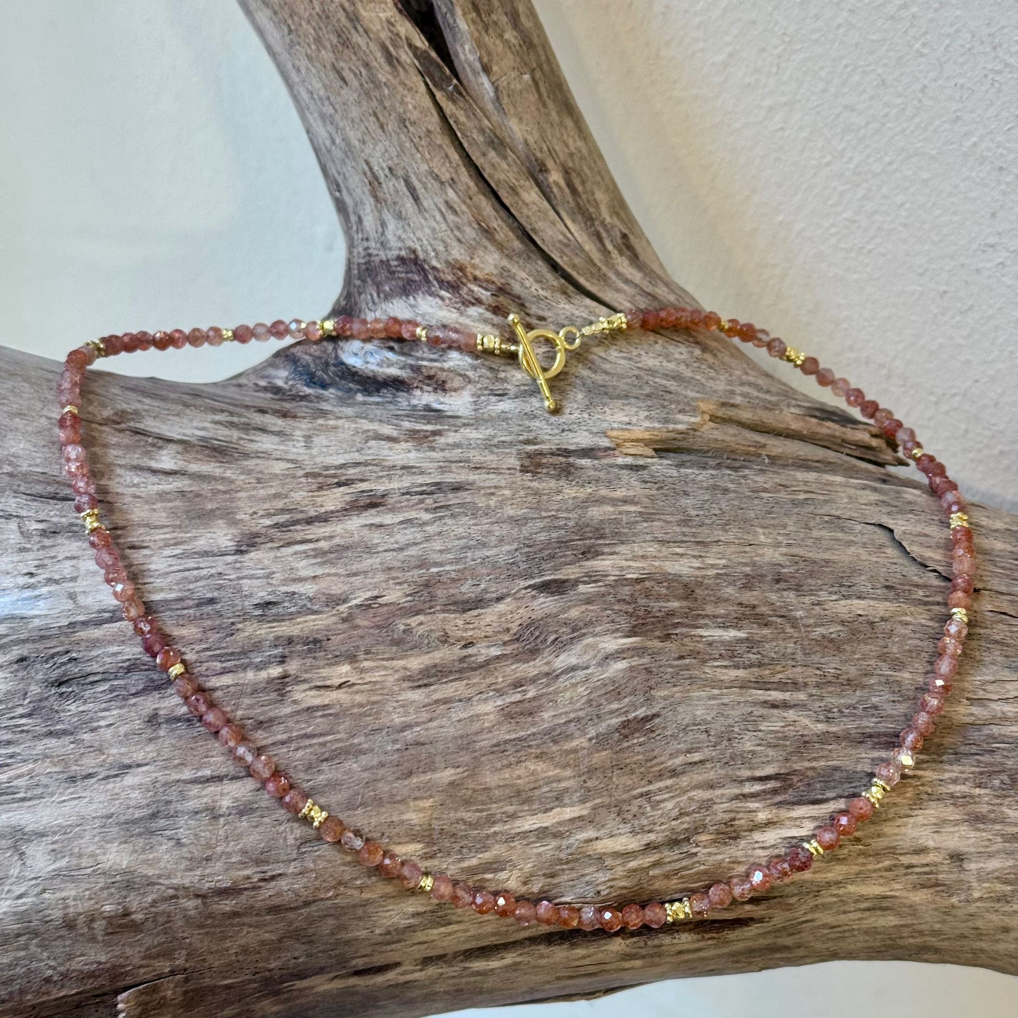 Diese schöne Kette haben wir aus sehr schön funkelndem facettiertem Sonnenstein (3mm), Zwischenstücken aus vergoldetem Sterlingsilber und einem dekorativen Ring-Stab-Verschluss aus vergoldetem Sterlingsilber kreiert. Die Kette hat eine Länge von 43cm.