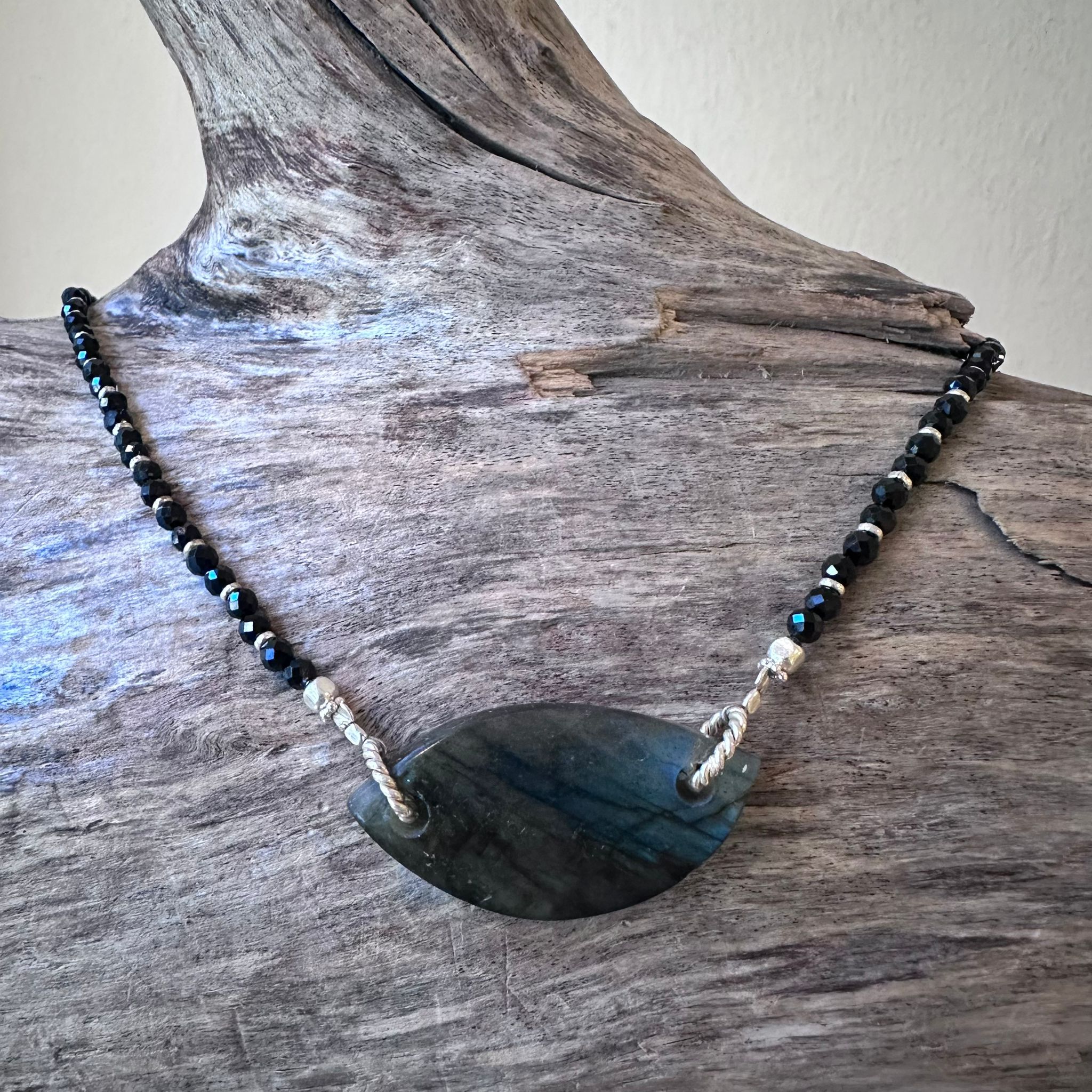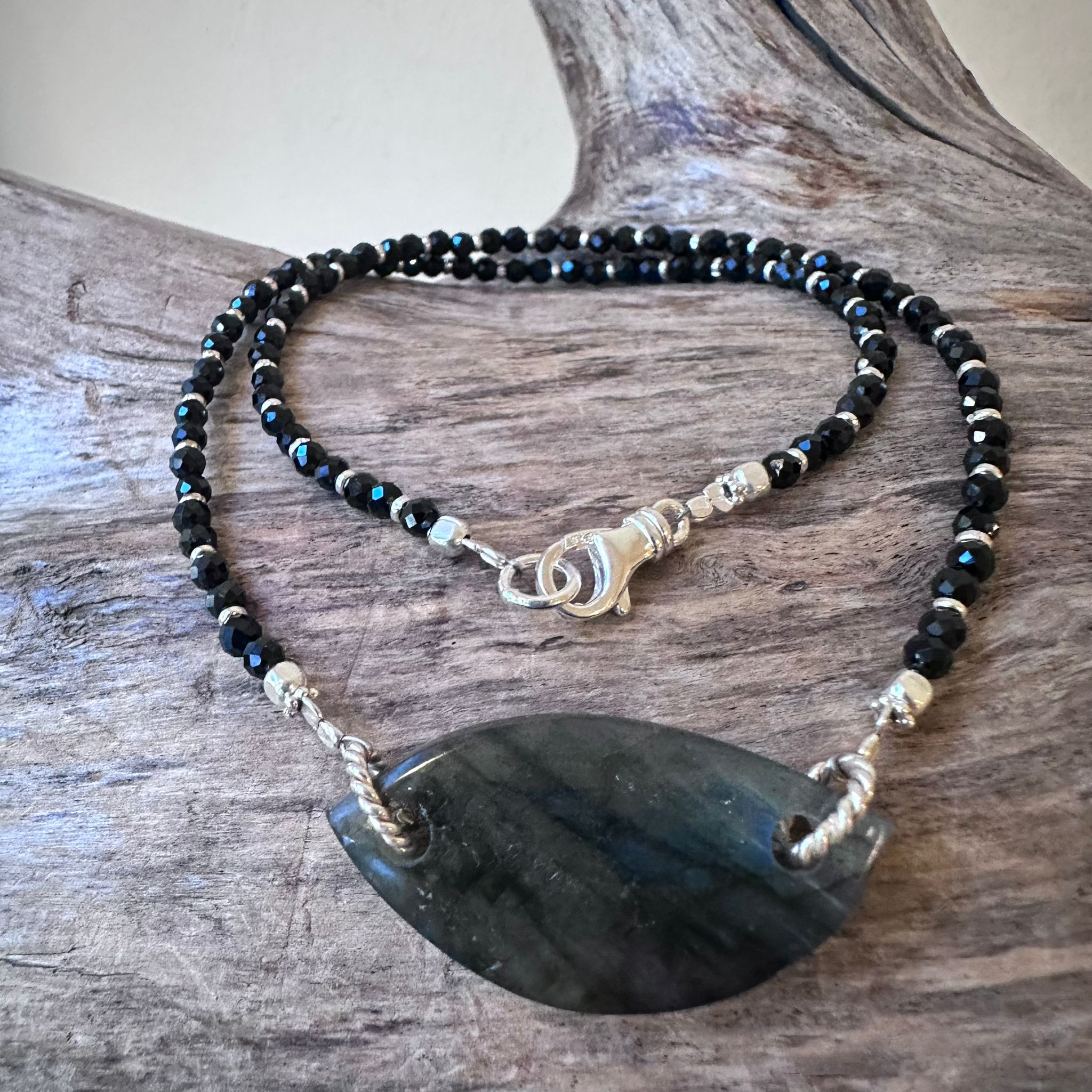 Diese schöne Kette haben wir aus facettiertem Spinell (3mm), sehr vielen Zwischenstücken aus Sterlingsilber und einem Element aus poliertem Labradorit (18x33mm) kreiert. Die Kette hat eine Länge von 42,5cm.