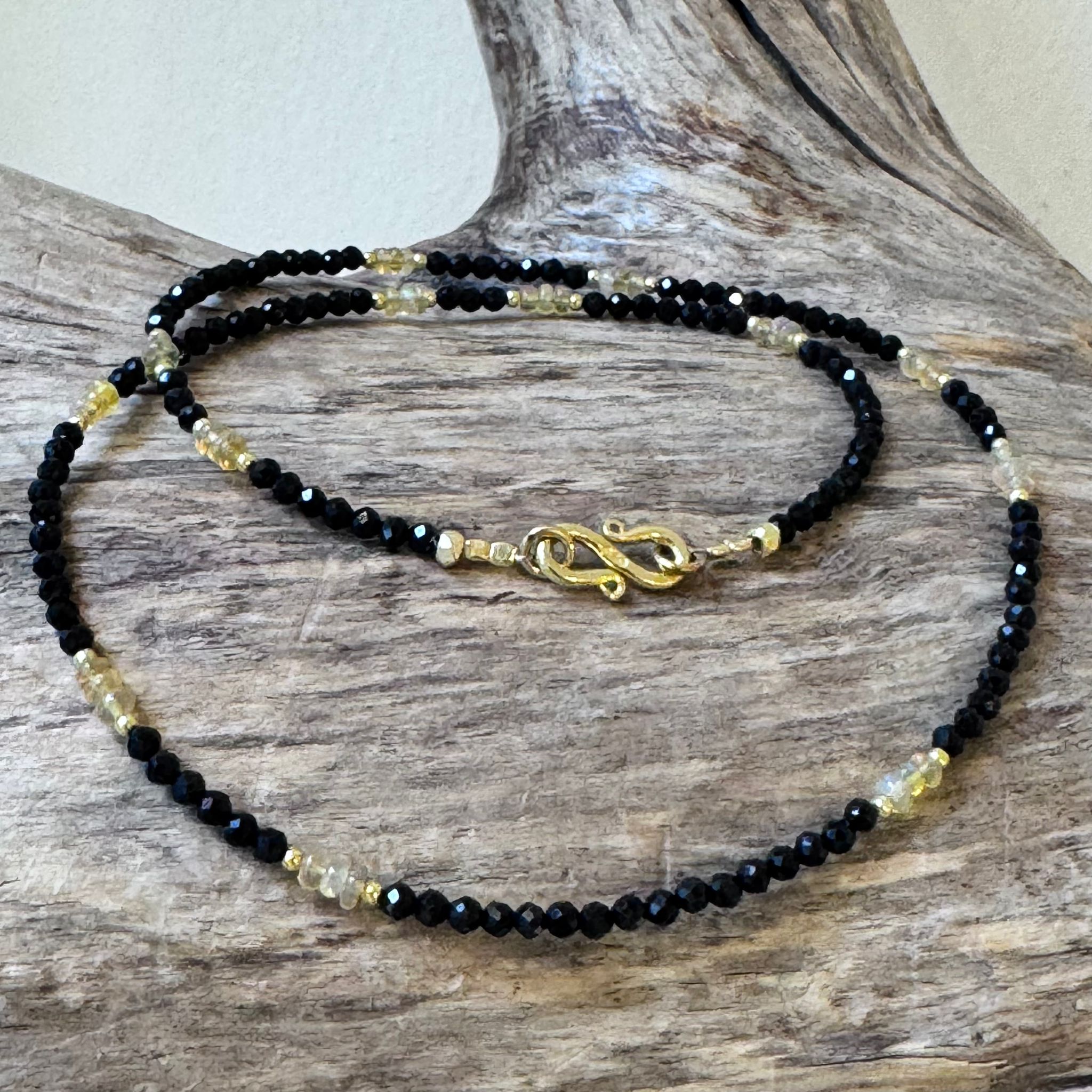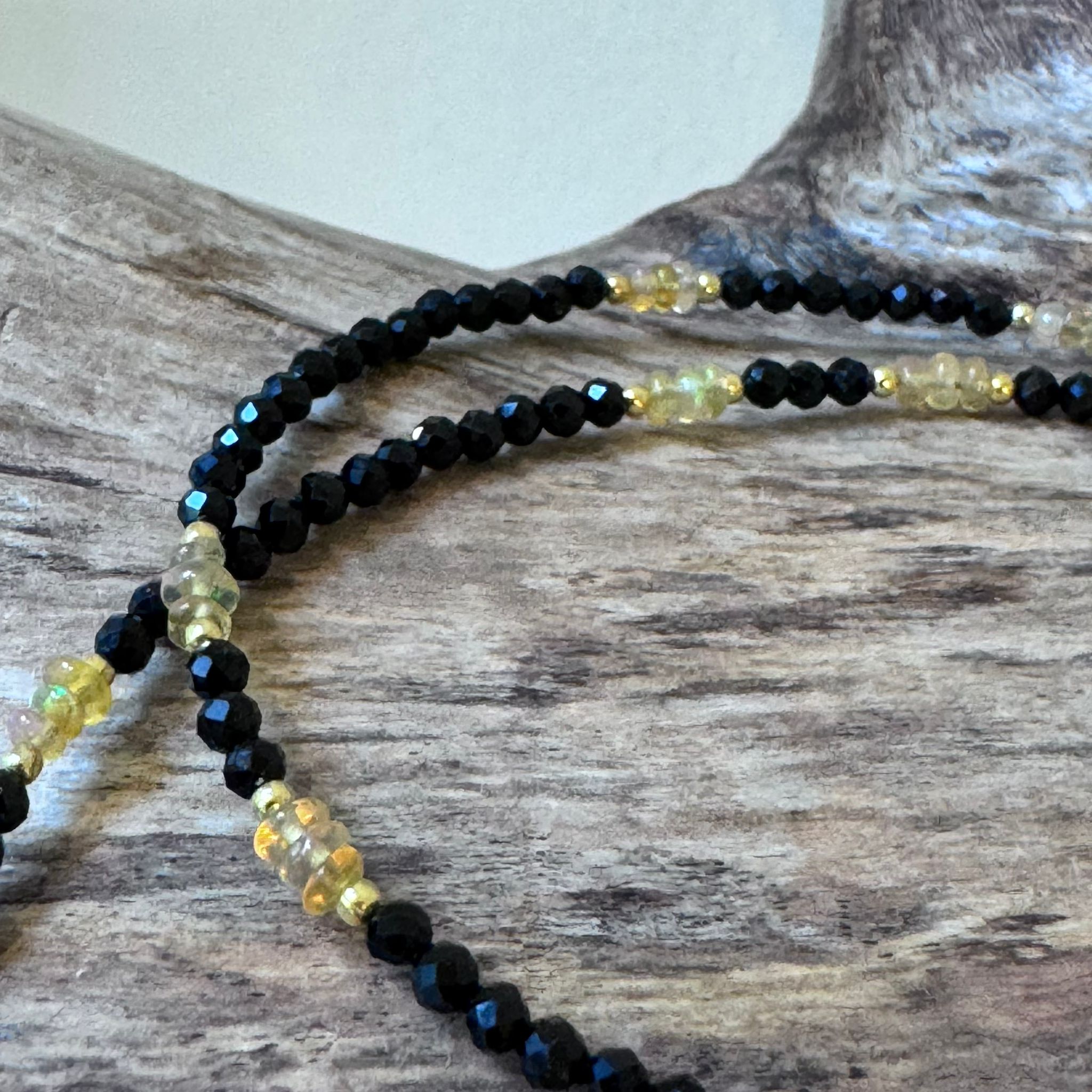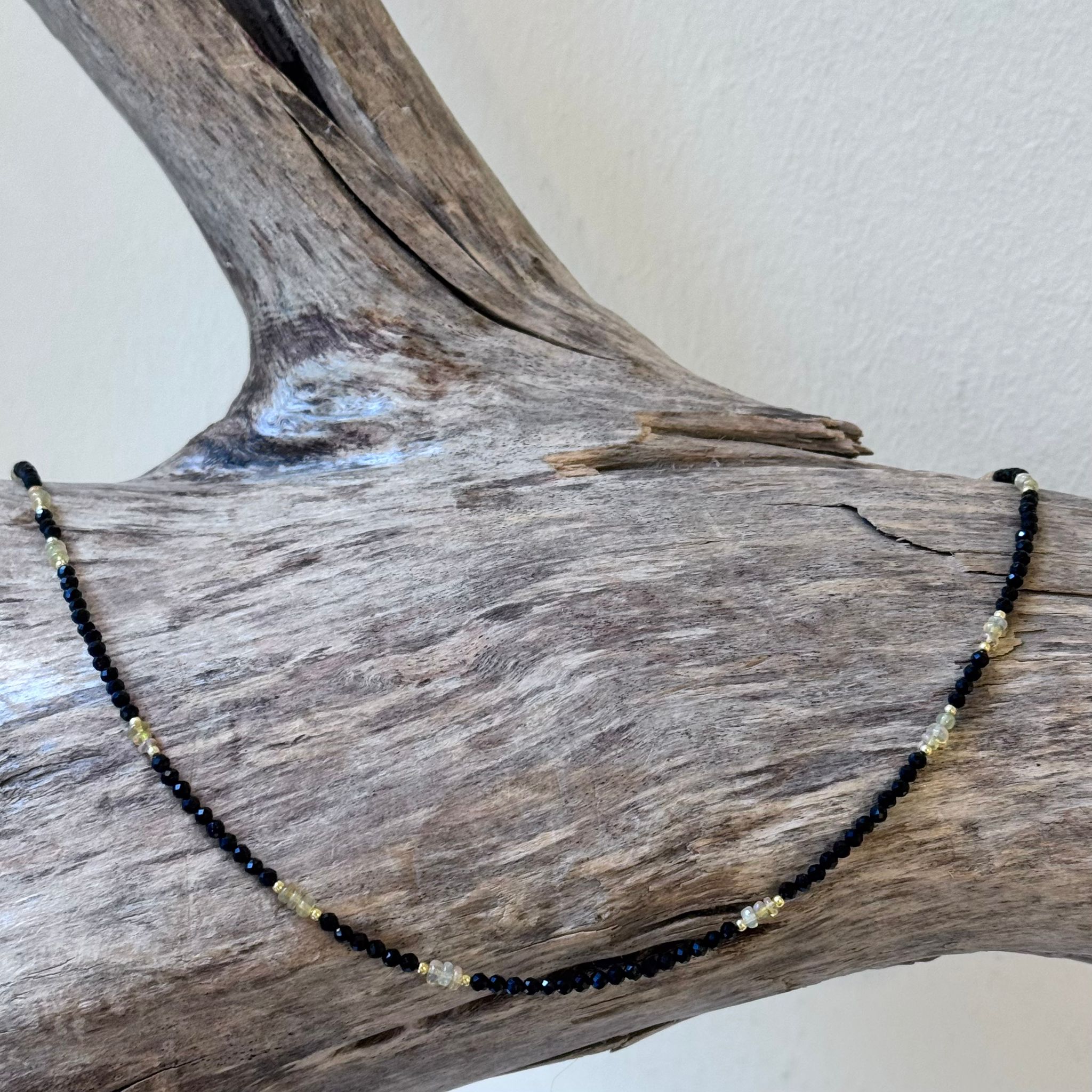 Diese schöne Kette haben wir aus facettiertem Spinell (2mm), Zwischenstücken aus vergoldetem Sterlingsilber, poliertem Welo Opal (ca. 1,5x2,5mm) und einem dekorativen S-Verschluss aus vergoldetem Sterlingsilber kreiert. Die Kette hat eine Länge von 42,5cm.