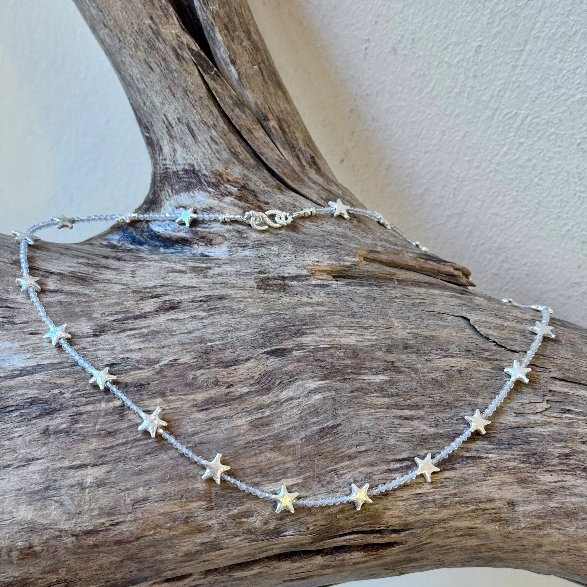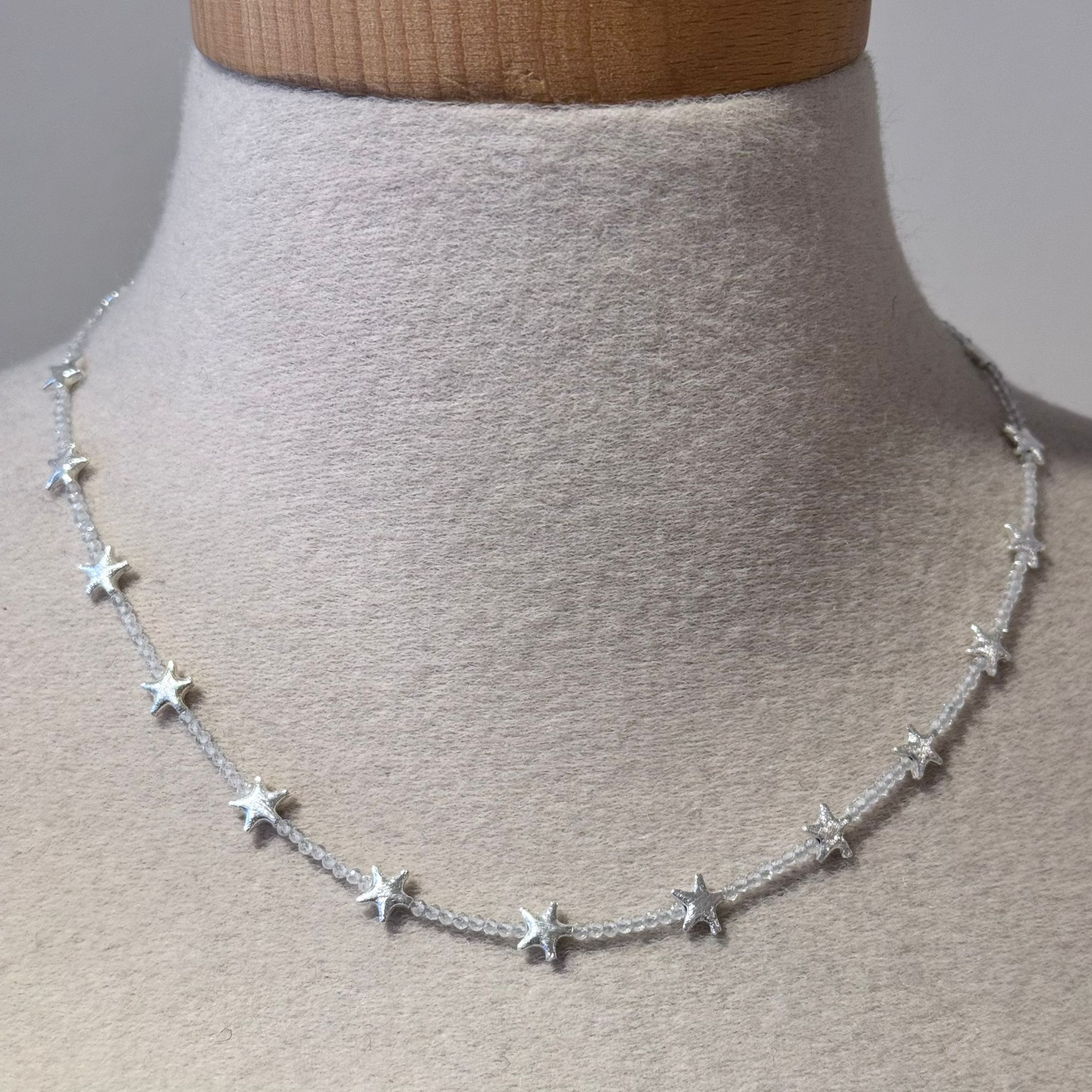 Diese schöne Kette haben wir aus facettiertem Topas (1,7mm), sternenförmigen Elementen aus mattiertem Sterlingsilber (7mm) und einem dekorativen S-Verschluss aus mattiertem Sterlingsilber kreiert. Die Kette hat eine Länge von 42,5cm.