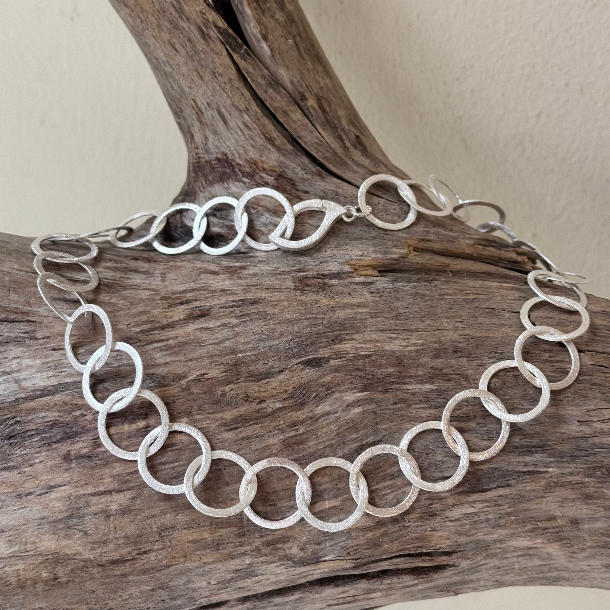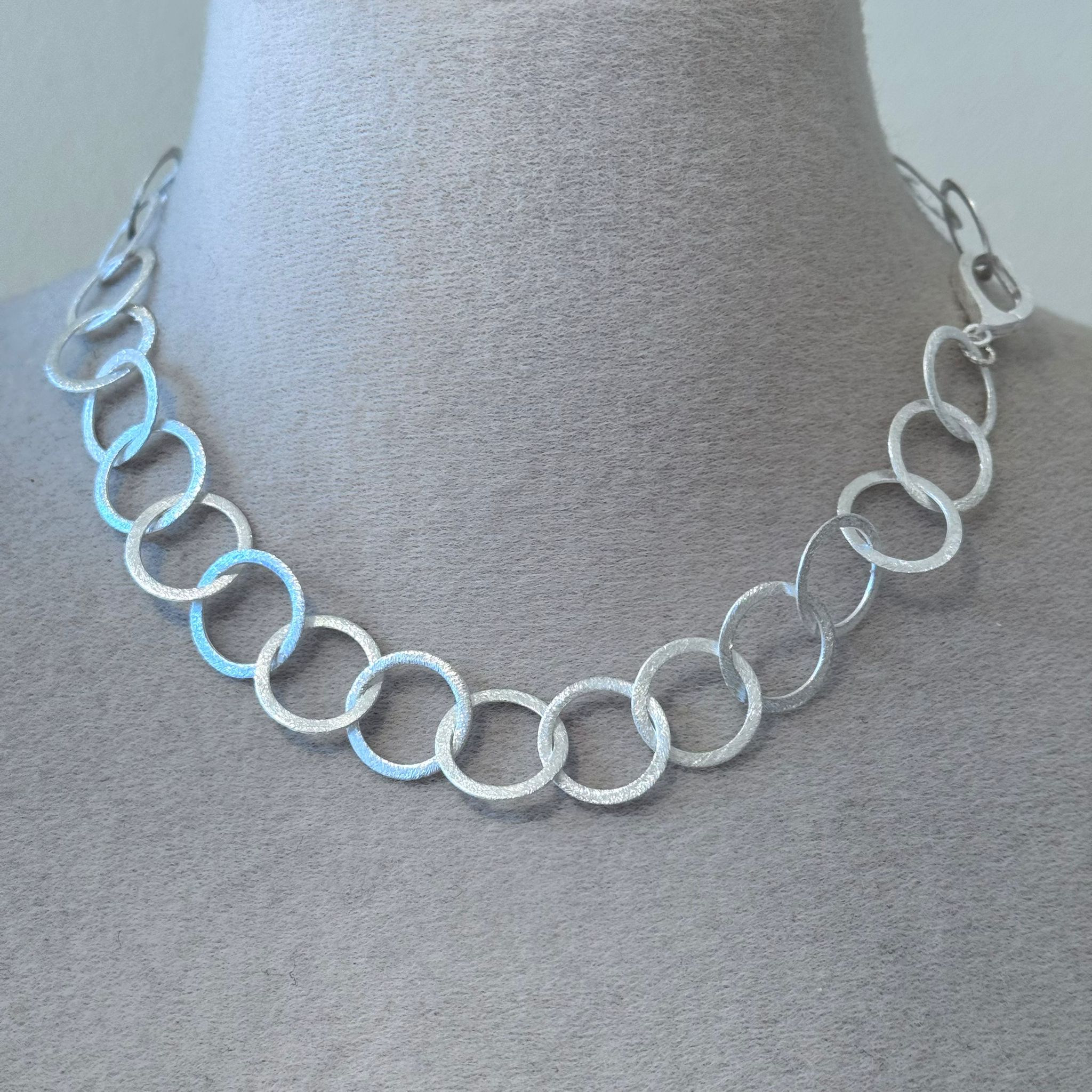 Diese schöne Kette haben wir aus kreisförmigen Elementen aus mattiertem Sterlingsilber (16mm) und einem sehr dekorativem Verschluss aus mattiertem Sterlingsilber kreiert. Die Kette hat eine Länge von 43cm.