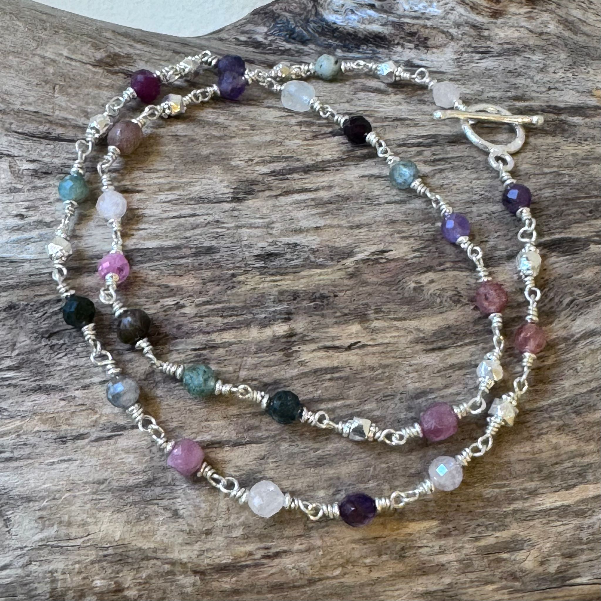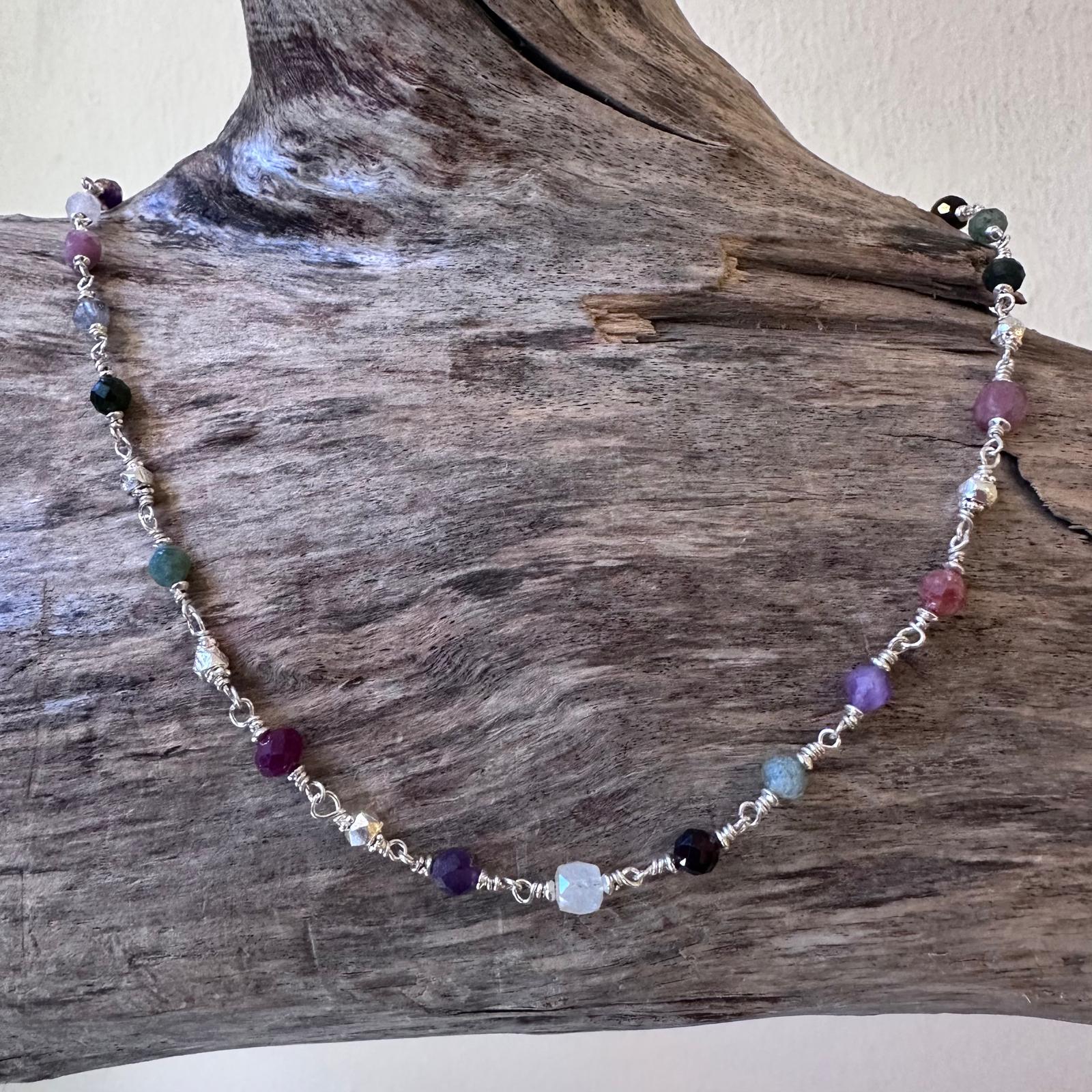 Diese schöne Kette haben wir aus Draht aus Sterlingsilber, Zwischenstücken aus Sterlingsilber, einem Mix aus facettierten Edelsteinen (3,5-4mm) und einem dekorativem Ring-Stab-Verschluss aus mattiertem Sterlingsilber kreiert. Die Kette hat eine Länge von 42,3cm.