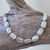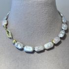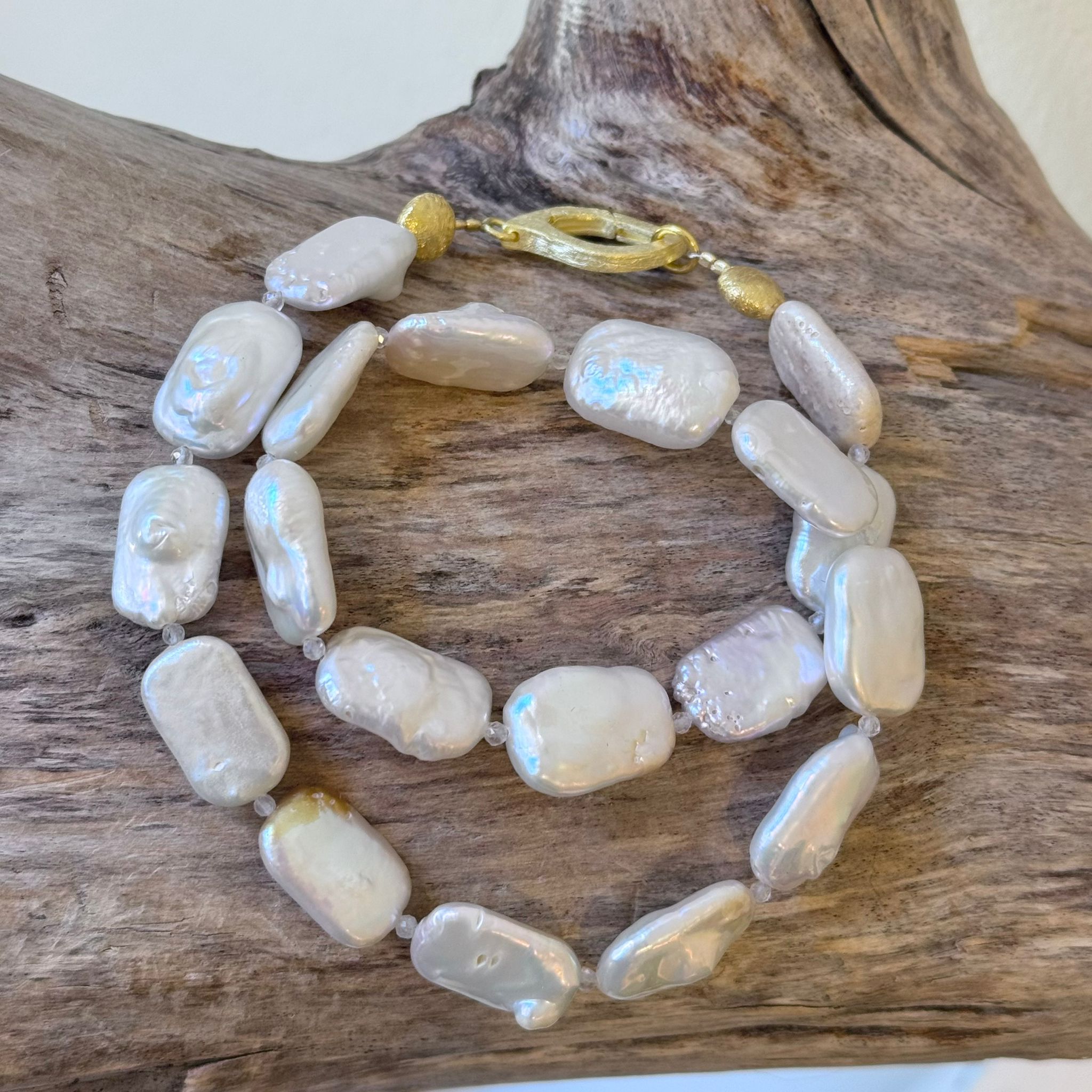 Diese schöne Kette haben wir aus rechteckigen Süsswasserperlen (ca. 17x11mm), facettiertem Regenbogen-Mondstein (2mm), Elementen aus mattiertem vergoldetem Sterlingsilber (7mm) und einem sehr dekorativem Verschluss aus mattiertem Sterlingsilber kreiert. Die Kette hat eine Länge von 42,3cm.
