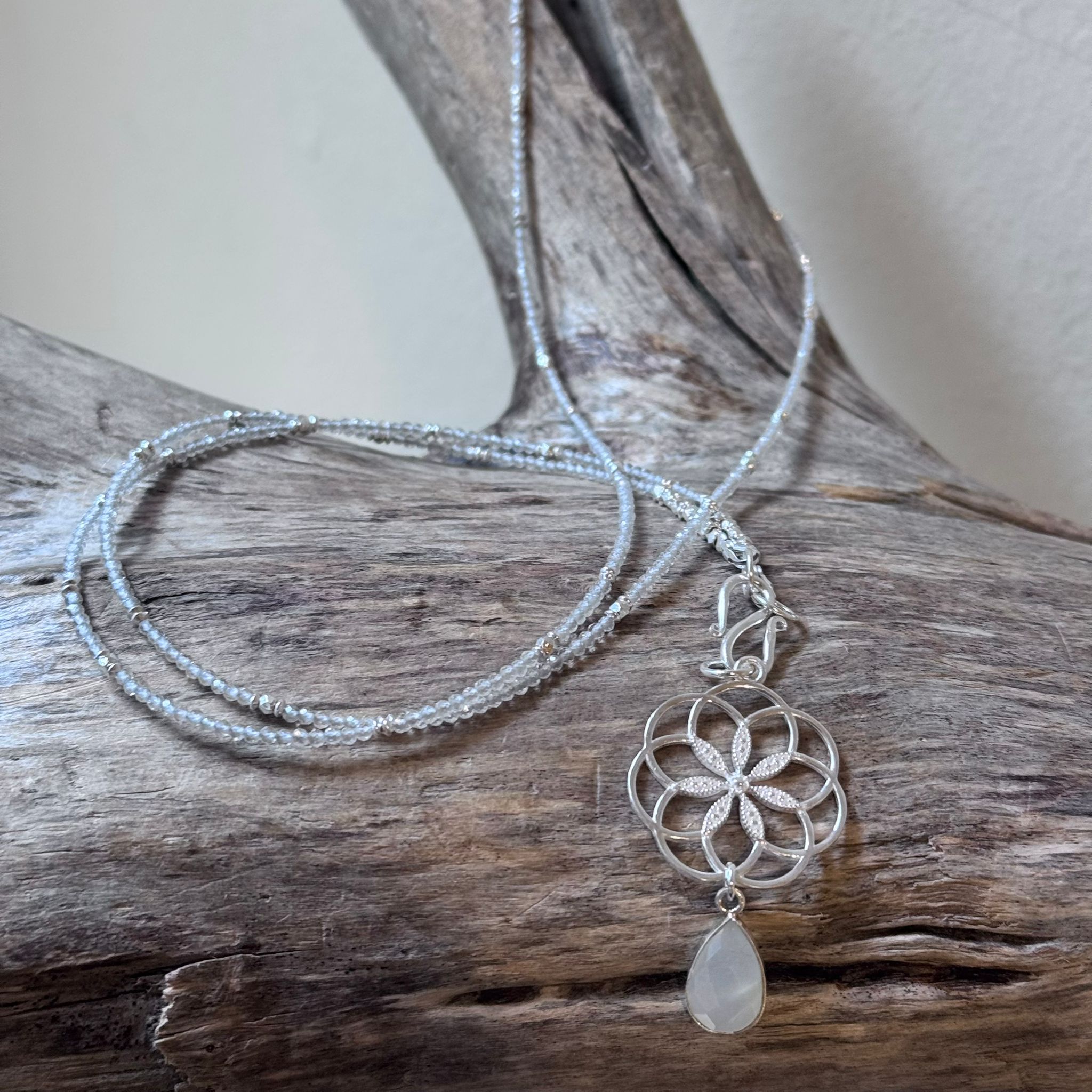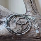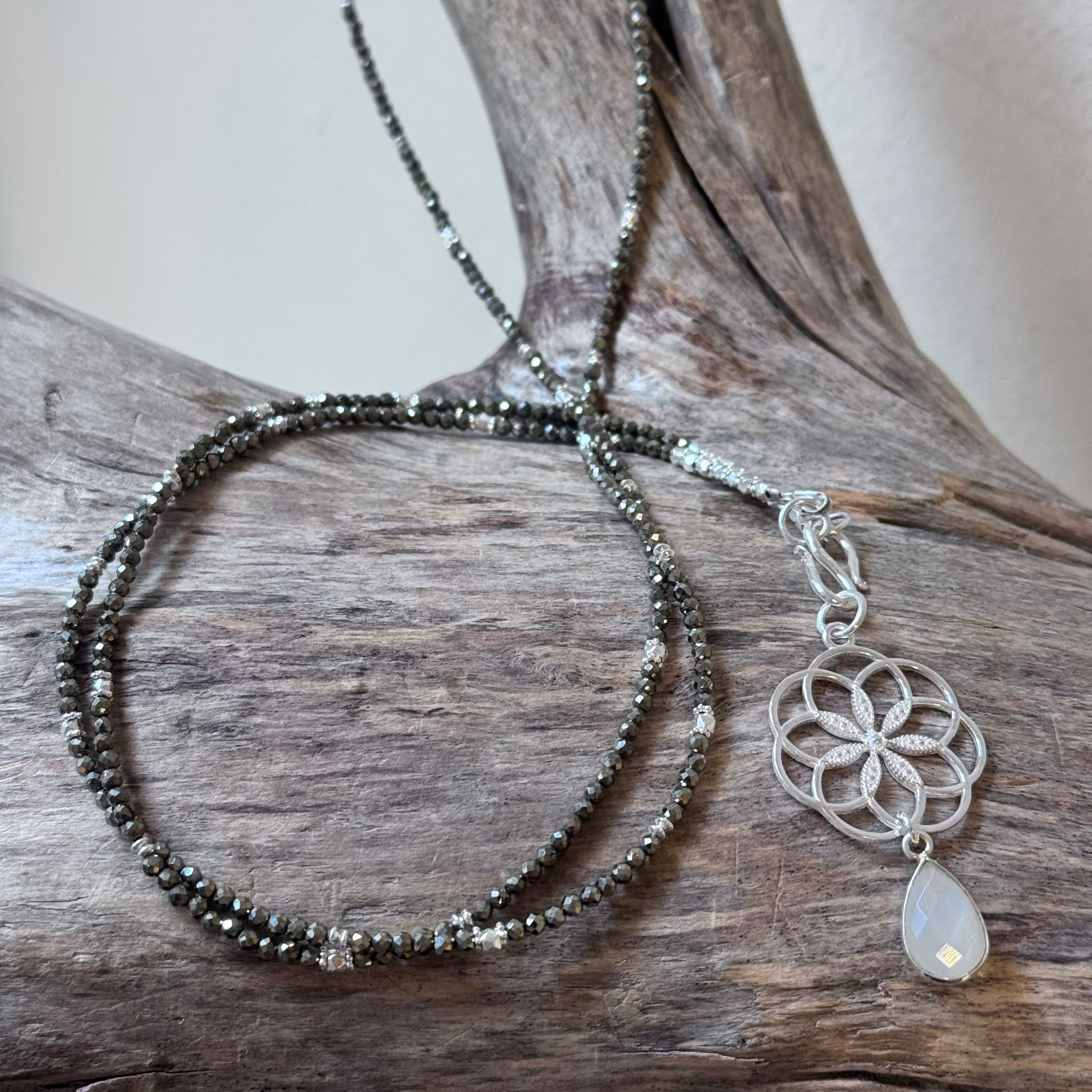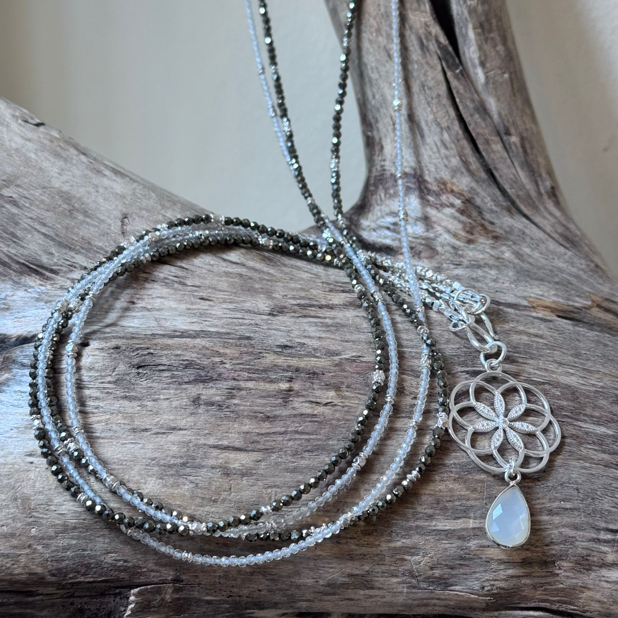 Diese sehr schöne Kette haben wir aus facettiertem Pyrit (2mm), facettiertem Zirkon (2mm) und Zwischenstücken aus Sterlingsilber kreiert. Die Ketten haben eine Länge von 90cm und lassen sich auch zweimal um den Hals wickeln. Diese Kette lässt sich vielfältig tragen (siehe Bilder). Den Anhänger haben wir aus einem Element aus Sterlingsilber (28mm) und einem tropfenförmigem hellgrauem Mondstein (15x9mm) kreiert. Der Anhänger hat eine Länge von 4,7cm.