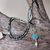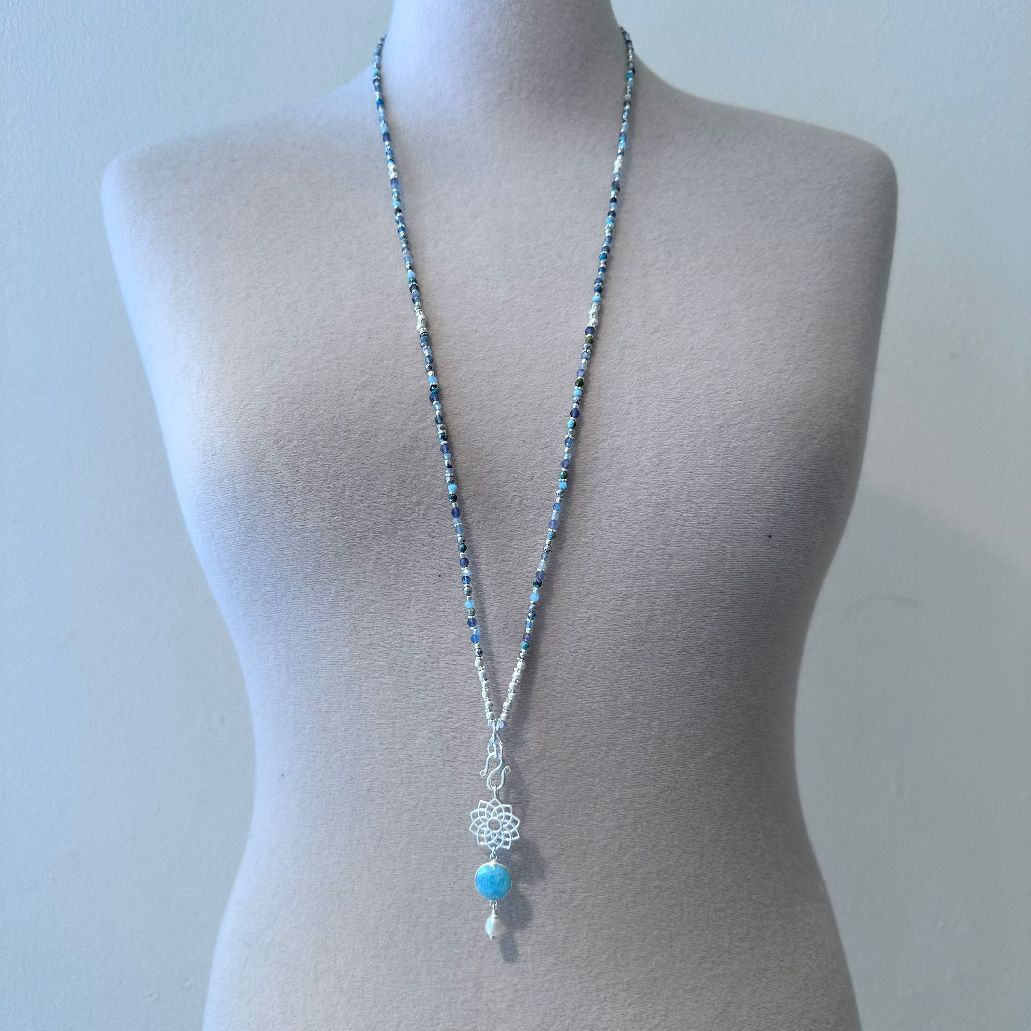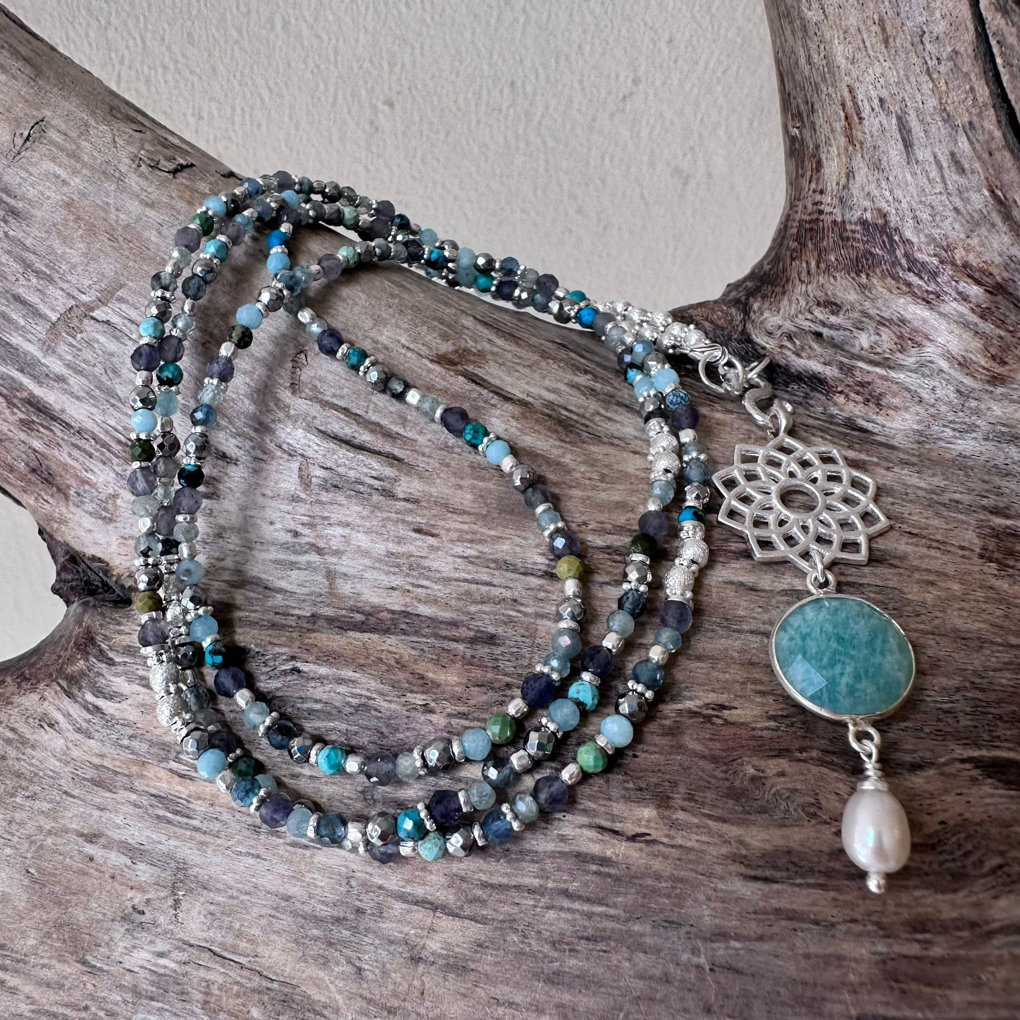 Diese schöne lange Kette haben wir aus facettiertem blauem Zirkon, Türkis, Iolith, Amazonit, bedampfter Hämatit (3mm) und sehr vielen Zwischenstücken aus Sterlingsilber kreiert. Die Kette hat eine Länge von 85cm und kann, zweimal um den Hals gewickelt, auch als kurze Kette getragen werden. Den Anhänger haben wir aus einem Element aus mattiertem Sterlingsilber (19mm), einem Verbindungselement aus facettiertem Amazonit (13mm) und einer tropfenförmigen Süsswasserperle (7x5mm) kreiert. Der Anhänger hat eine Länge von 5,5cm.