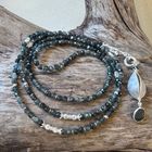 Diese schöne lange Kette haben wir aus facettiertem blau-grünem Kyanit (4mm), sehr vielen Zwischenstücken aus Sterlingsilber und münzförmigen Elementen aus mattiertem Sterlingsilber (4mm) kreiert. Die Kette hat eine Länge von 87,5cm und kann, zweimal um den Hals gewickelt, auch als kurze Kette getragen werden. Den Anhänger haben wir aus einem blau-grünem Kyanit (4mm), einem Element aus mattiertem Sterlingsilber (25x15mm) und einem facettiertem Labradorit (12x8mm) kreiert. Der Anhänger hat eine Länge von 5,3cm.