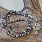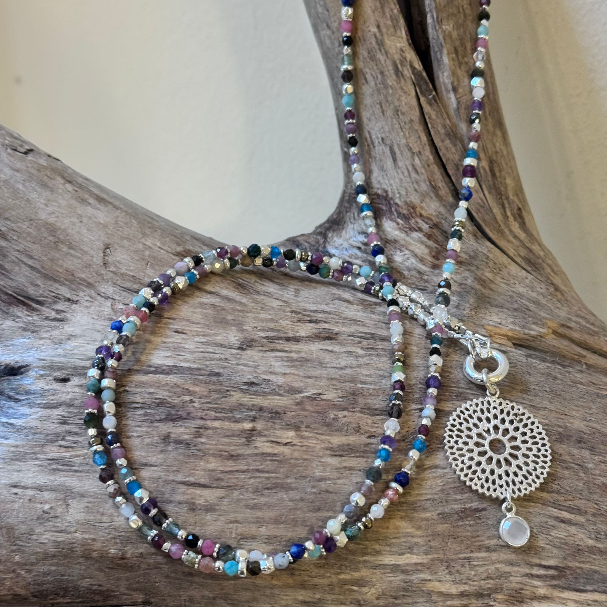 Diese schöne lange Kette haben wir aus verschiedensten facettierten Edelsteinen (2,5-3mm) und sehr vielen Zwischenstücken aus Sterlingsilber kreiert. Die Kette hat eine Länge von 89cm und kann, zweimal um den Hals gewickelt, auch als kurze Kette getragen werden. Den Anhänger haben wir aus einem Element aus mattiertem Sterlingsilber (25mm) und einem Charm aus facettiertem Mondstein (6mm) kreiert. Der Anhänger hat eine Länge von 4cm.