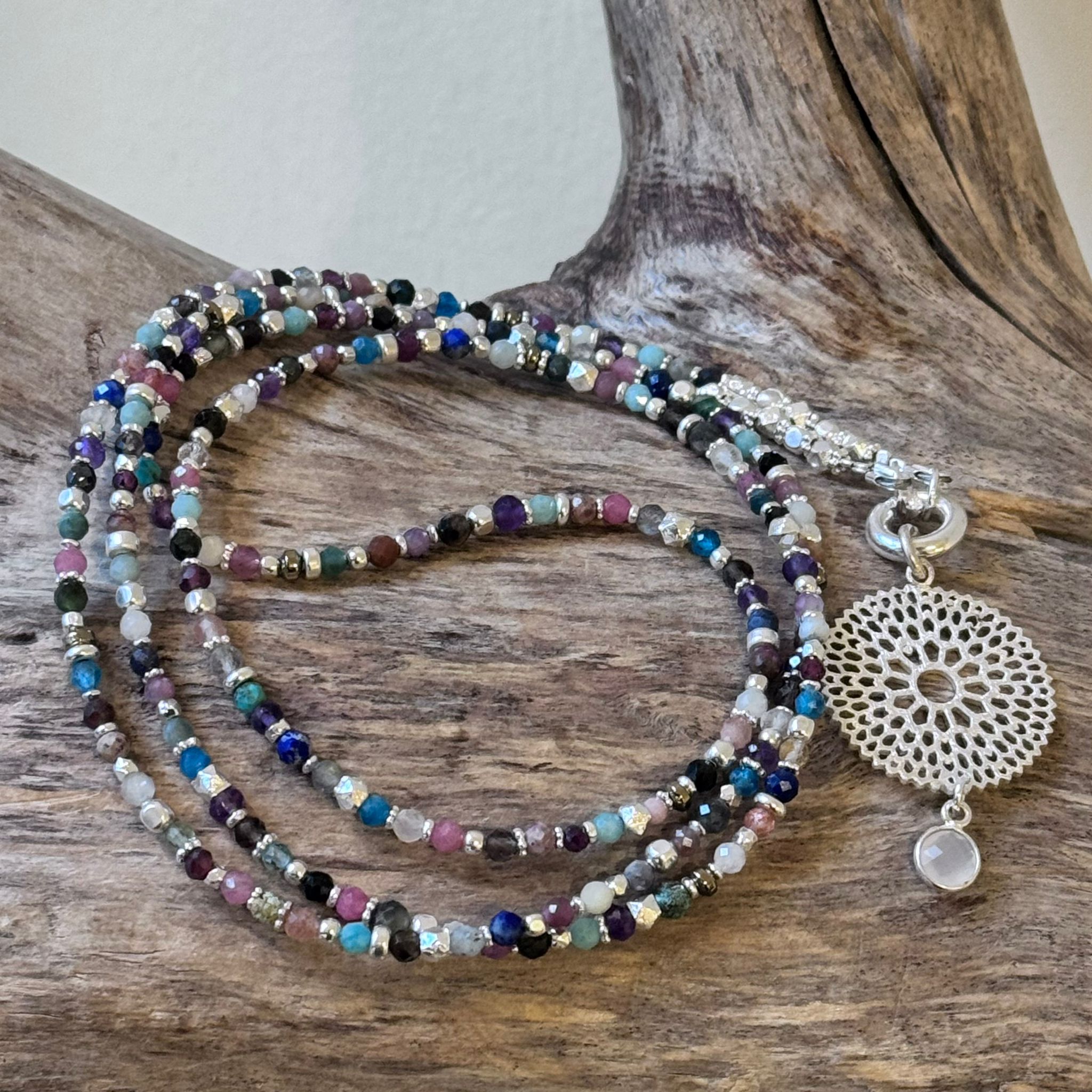 lange Kette facettierter Edelstein-Mix und Sterlingsilber