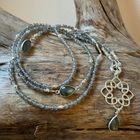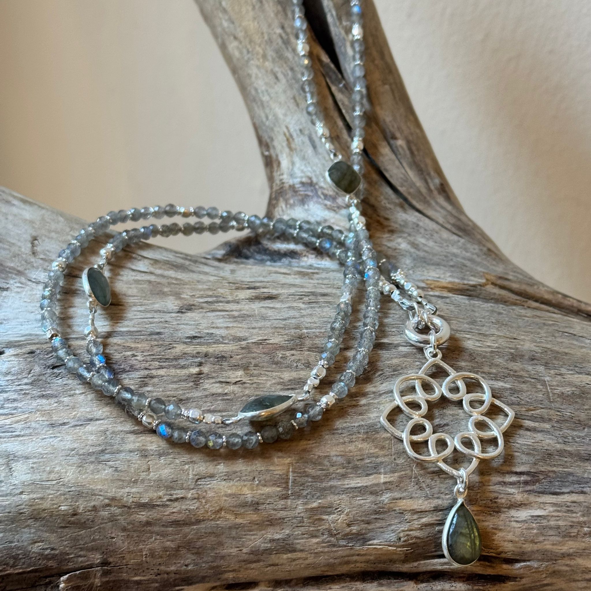 Diese schöne lange Kette haben wir aus facettiertem Labradorit in sehr schöne Qualität (3mm), sehr vielen Zwischenstücken aus Sterlingsilber und drei Verbindungselementen aus facettiertem Labradorit (10mm und 2x14.10mm) kreiert. Die Kette hat eine Länge von 88cmm und kann, zweimal um den Hals gewickelt auch als kurze Kette getragen werden. Den Anhänger haben wir aus einem Element aus Sterlingsilber (30mm) und einem tropfenförmigem facettiertem Labradorit (14x10mm) kreiert. Der Anhänger hat eine Länge von 5cm.