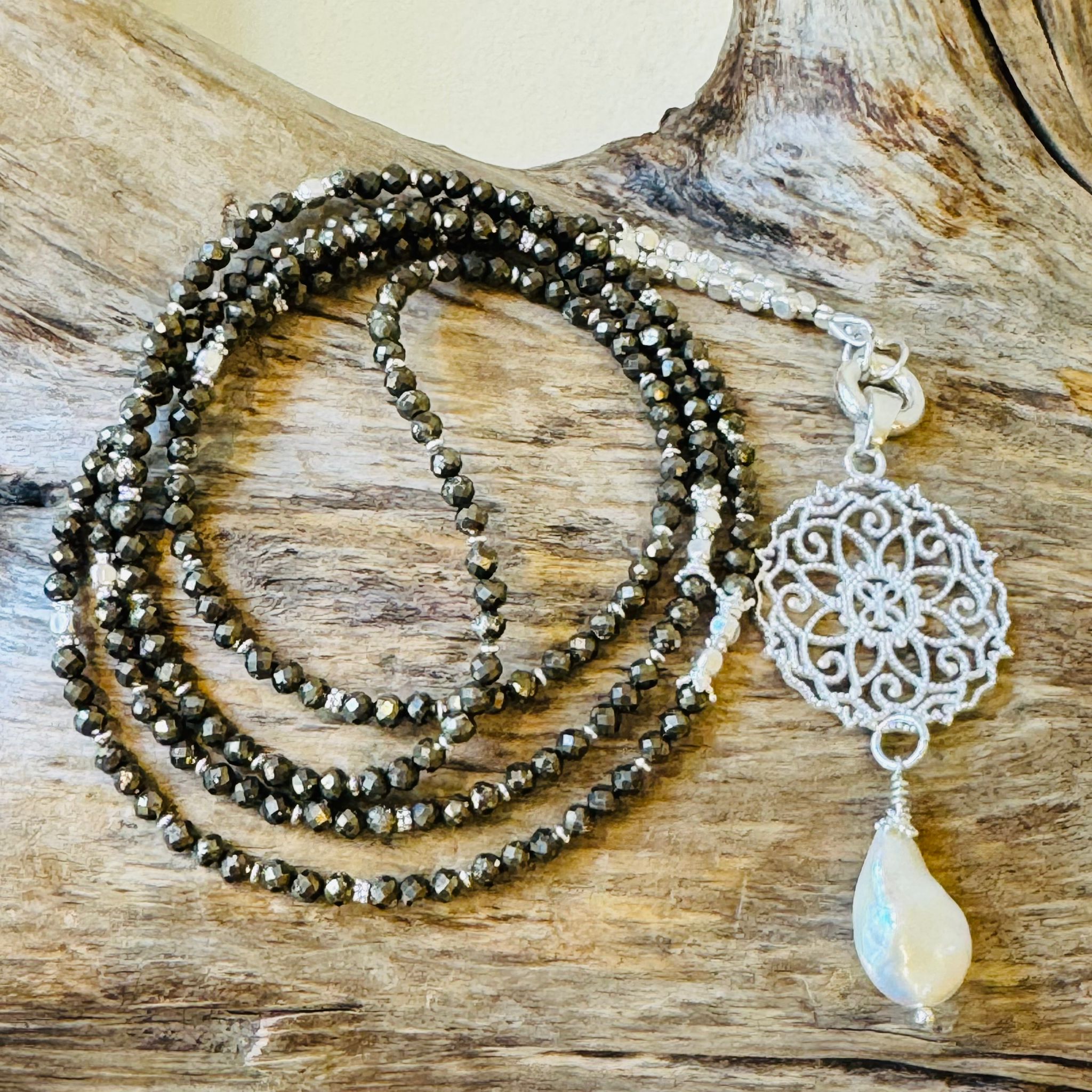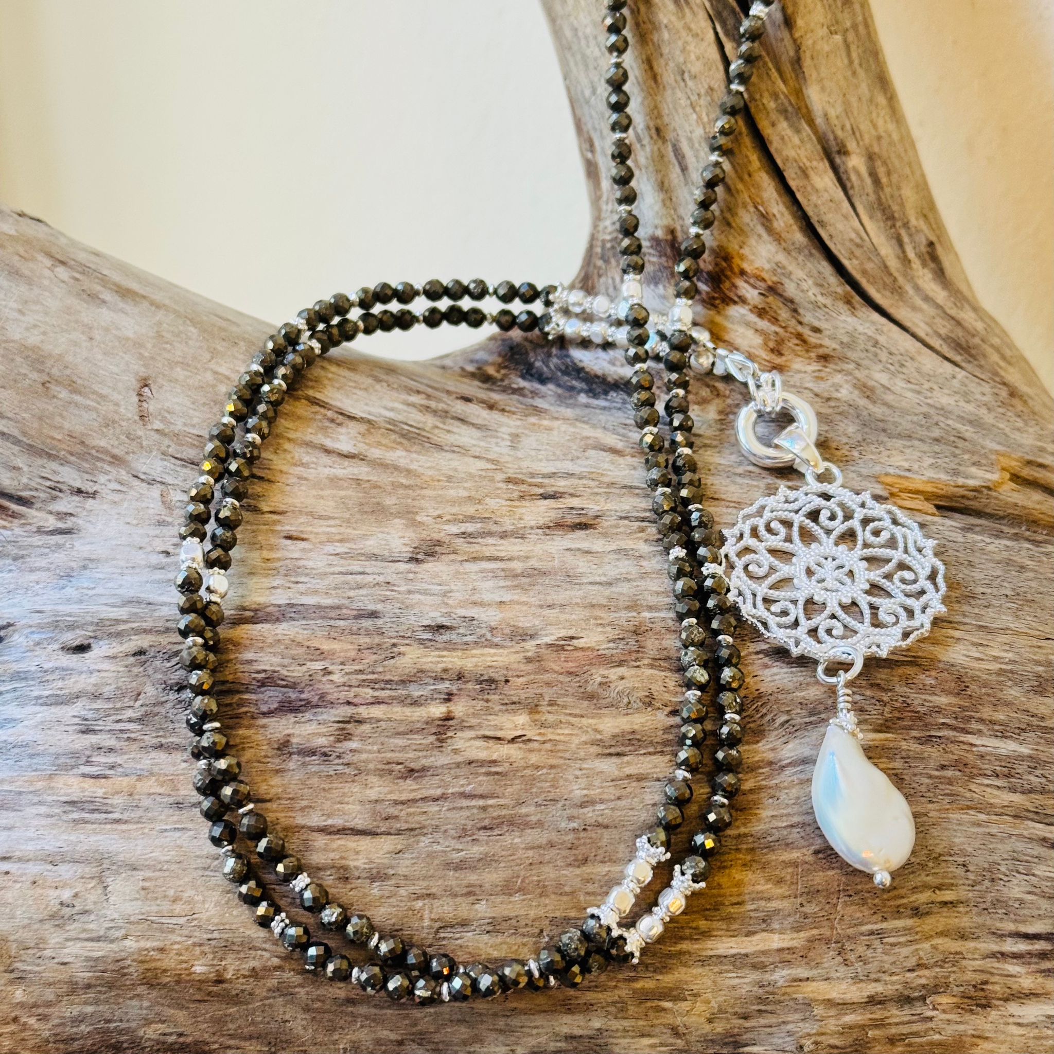 Diese schöne lange Kette haben wir aus facettiertem Pyrit (3mm) und sehr vielen Zwischenstücken aus Sterlingsilber kreiert. Die Kette hat eine Länge von 88,5cm und kann, zweimal um den Hals gewickelt, auch als kurze Kette getragen werden. Den Anhänger haben wir aus einem Element aus granuliertem Sterlingsilber (28mm) und einer tropfenförmigen Süsswasserperle (18x11mm) kreiert. Der Anhänger hat eine Länge von 6,8cm.