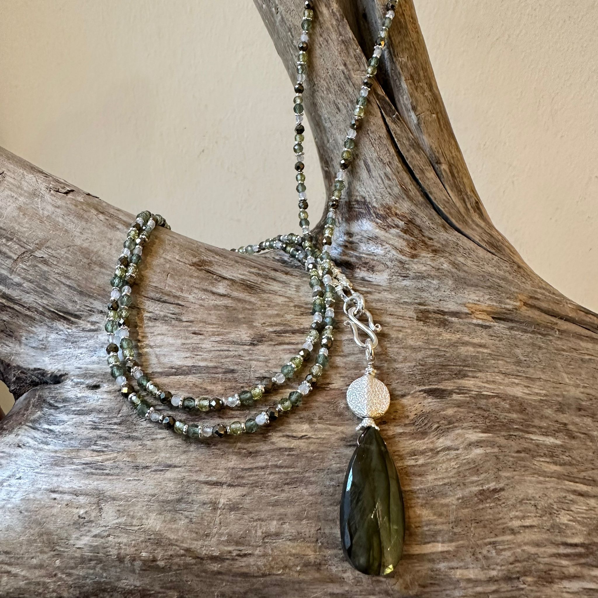 Diese sehr schöne lange Kette haben wir aus facettiertem Vessonit (2x3mm), facettiertem grünem Apatit (3mm), facettierem Pyrit, Regenbogen-Monstein (2mm) und sehr vielen Zwischenstücken aus Sterlingsilber kreiert. Die Kette hat eine Länge von 89cm und kann, zweimal um den Hals gewickelt, auch als kurze Kette getragen werden. Den Anhänger haben wir aus einem Element aus Sterlingsilber (10mm) und einem facettiertem Labradorit in Tropfenform (29x13mm) kreiert. Der Anhänger hat eine Länge von 5,3cm.