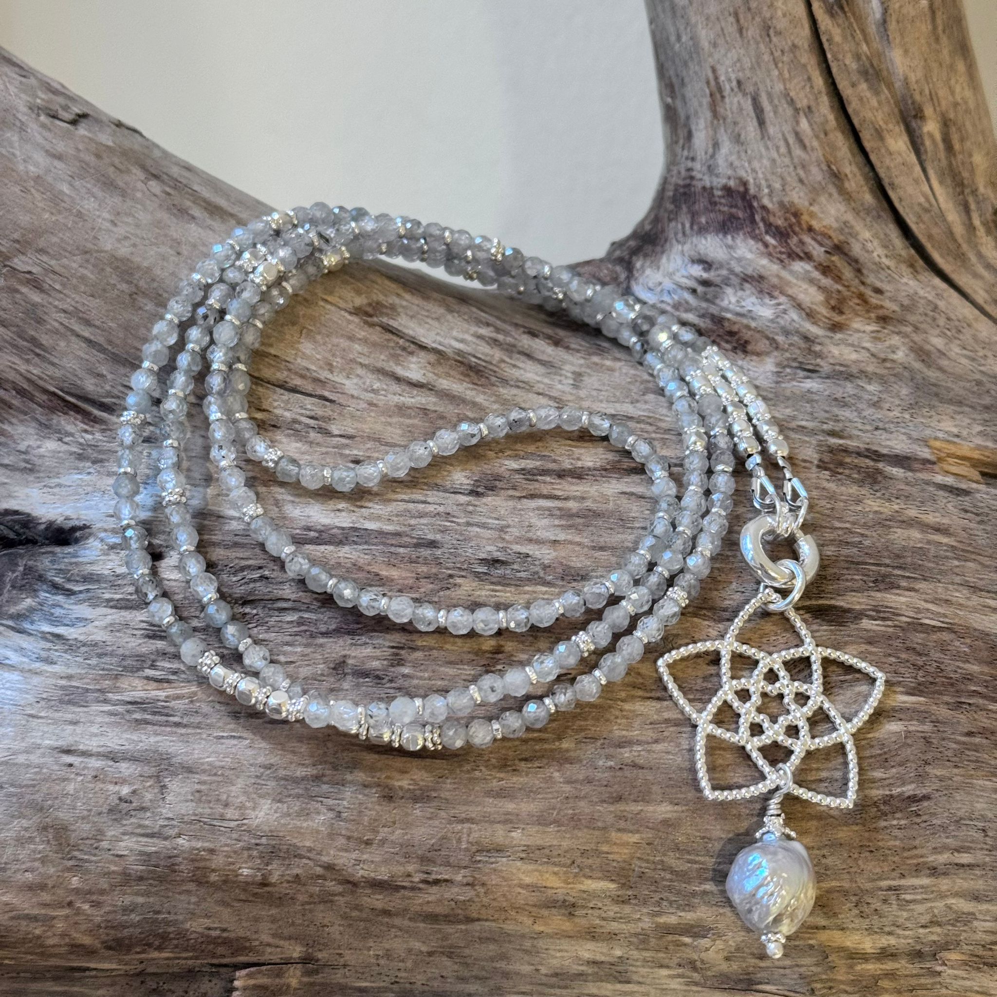 Diese schöne lange Kette haben wir aus sehr schön funkelndem facettiertem hellgrauem Zirkon (3mm) und sehr vielen Zwischenenstücken aus Sterlingsilber kreiert. Die Kette hat eine Länge von 89cm und kann, zweimal um den Hals gewickelt, auch als kurze Kette getragen werden. Den Anhänger haben wir aus einem Element aus Sterlingsilber (28mm) und einer tropfenförmigen hellgrauen Süsswasserperle (13x10mm) kreiert. Der Anhänger hat eine Länge von 4,8cm.