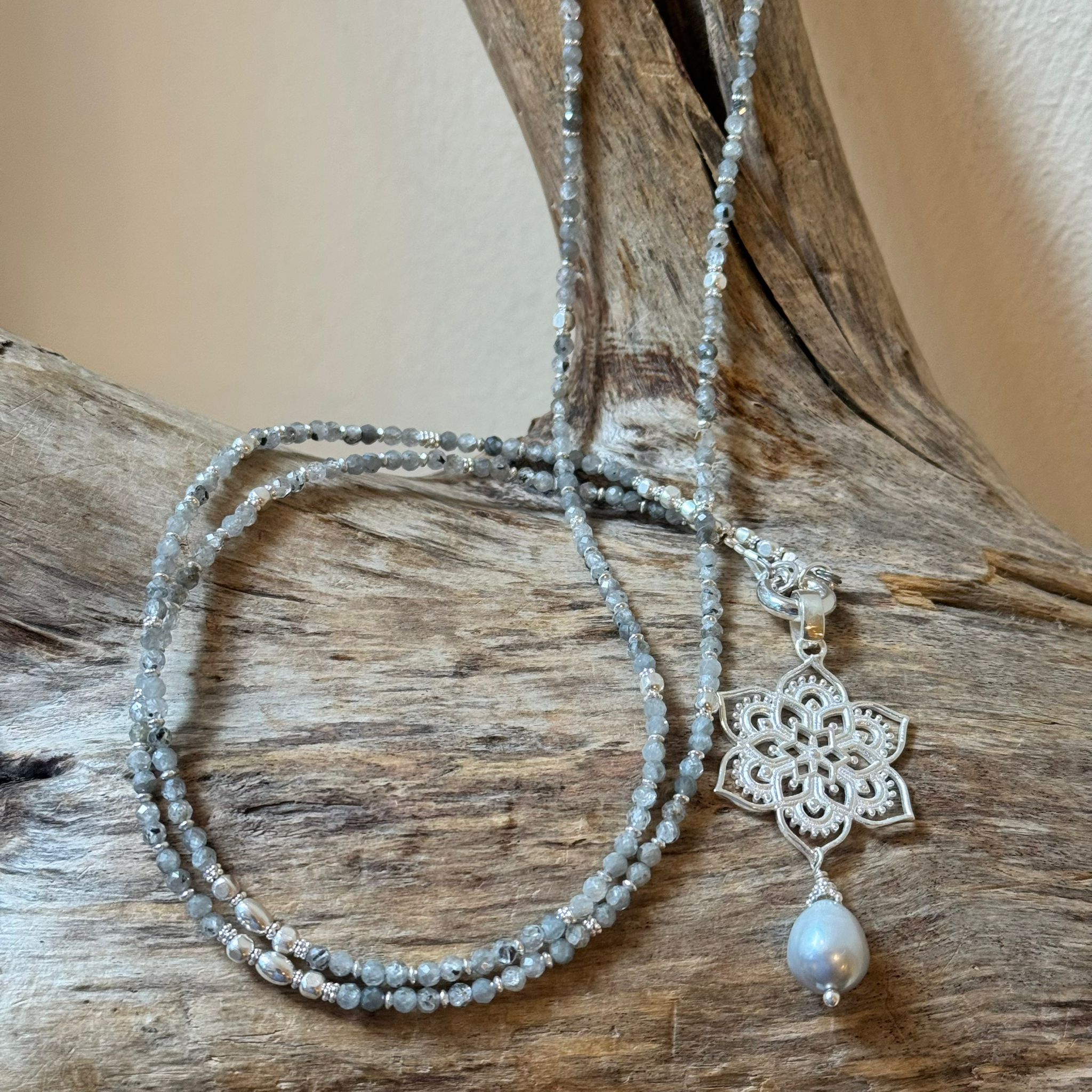 Diese schöne lange Kette haben wir aus sehr schön funkelndem hellgrauem Zirkon (3mm) und sehr vielen Zwischenstücke aus Sterlingsilber kreiert. Die Kette hat eine Länge von 88cm und kann, zweimal um den Hals gewickelt, auch als kurze Kette getragen werden. Den Anhänger haben wir aus einem Element aus Sterlingsilber (30mm) und einer tropfenförmigen hellgrauen Süsswasserperle (10x9mm) kreiert. Der Anhänger hat eine Länge von 5,5cm.