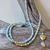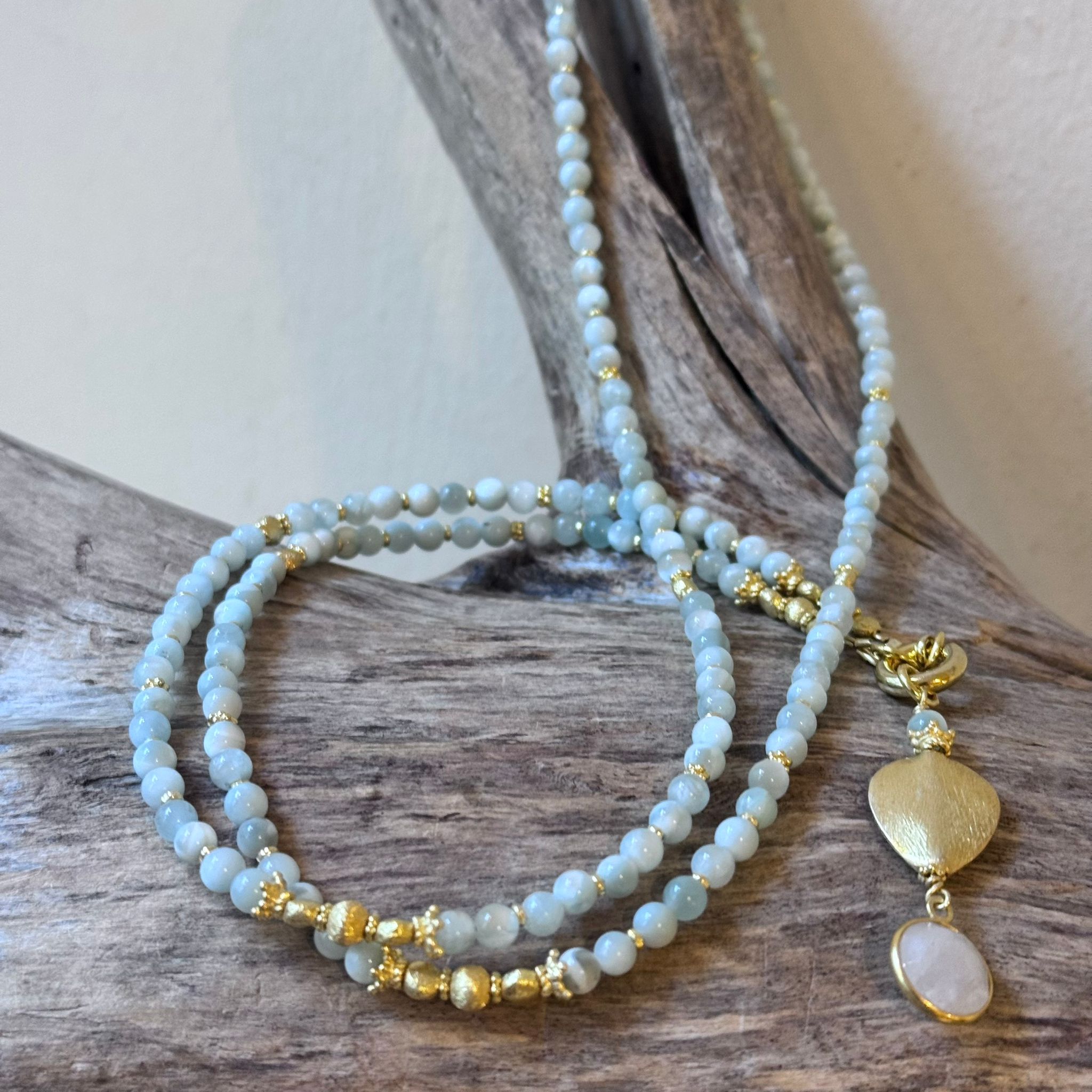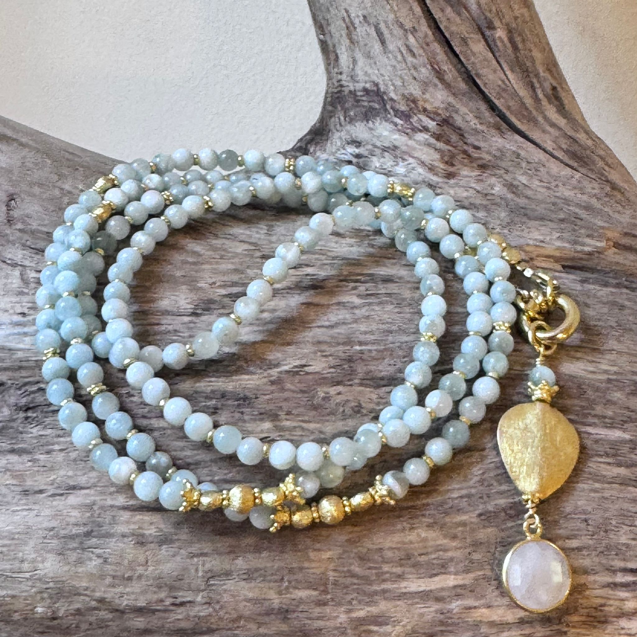 Diese schöne lange Kette haben wir aus poliertem hellgrünem Mondstein (4mm), sehr vielen Zwischenstücken aus vergoldetem Sterlingsilber und Kugeln und Elementen aus mattiertem vergoldetem Sterlingsilber (4mm und 5mm) kreiert. Die Kette hat eine Länge von 89,5cm und kann, zweimal um den Hals gewickelt, auch als kurze Kette getragen werden. Den Anhänger haben wir aus einem hellgrünen Mondstein (4mm), einem Element aus mattiertem vergoldetem Sterlingsilber (18x14mm) und einem facettiertem Regenbogen-Mondstein (12mm) kreiert. Der Anhänger hat eine Länge von 4,7cm.