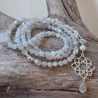 Diese schöne lange Kette haben wir aus poliertem Mondstein (6mm), Kugeln aus Sterlingsilber (6mm) und sehr vielen Zwischenstücken aus Sterlingsilber kreiert. Die Kette hat eine Länge von 89cm und kann, zweimal um den Hals gewickelt, auch als kurze Kette getragen werden. Den Anhänger haben wir aus einer Süsswasserperle (7mm), einem Element aus Sterlingsilber (30mm) und einem tropfenförmigem facettiertem Mondstein (15x9mm) kreiert. Der Anhänger hat eine Länge von 7cm.