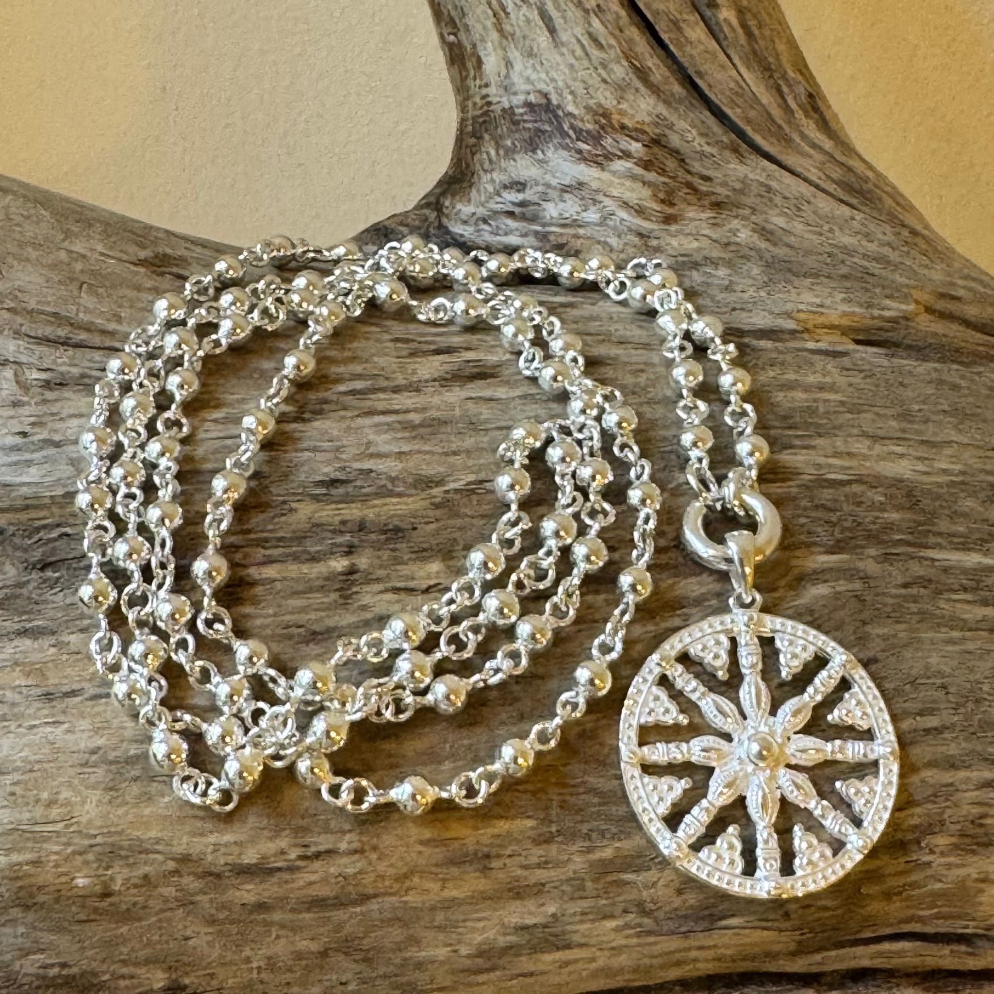Schöne lange Kette aus Sterlingsilber (3mm). Die Kette hat eine Länge von 89cm und kann, zweimal um den Hals gewickelt auch als kurze Kette getragen werden. Der dekorative Anhänger aus Sterlingsilber hat einen Durchmesser von 29mm.