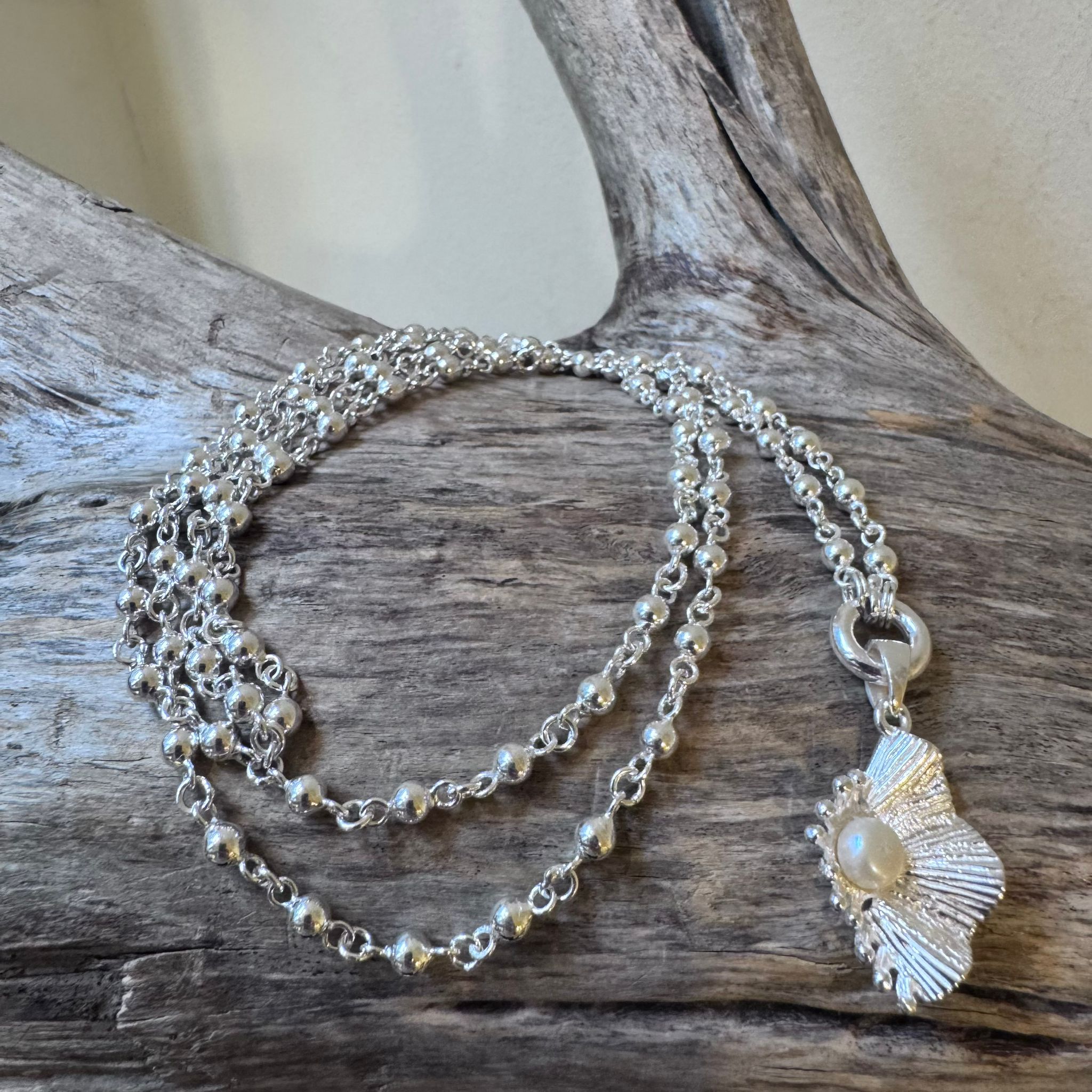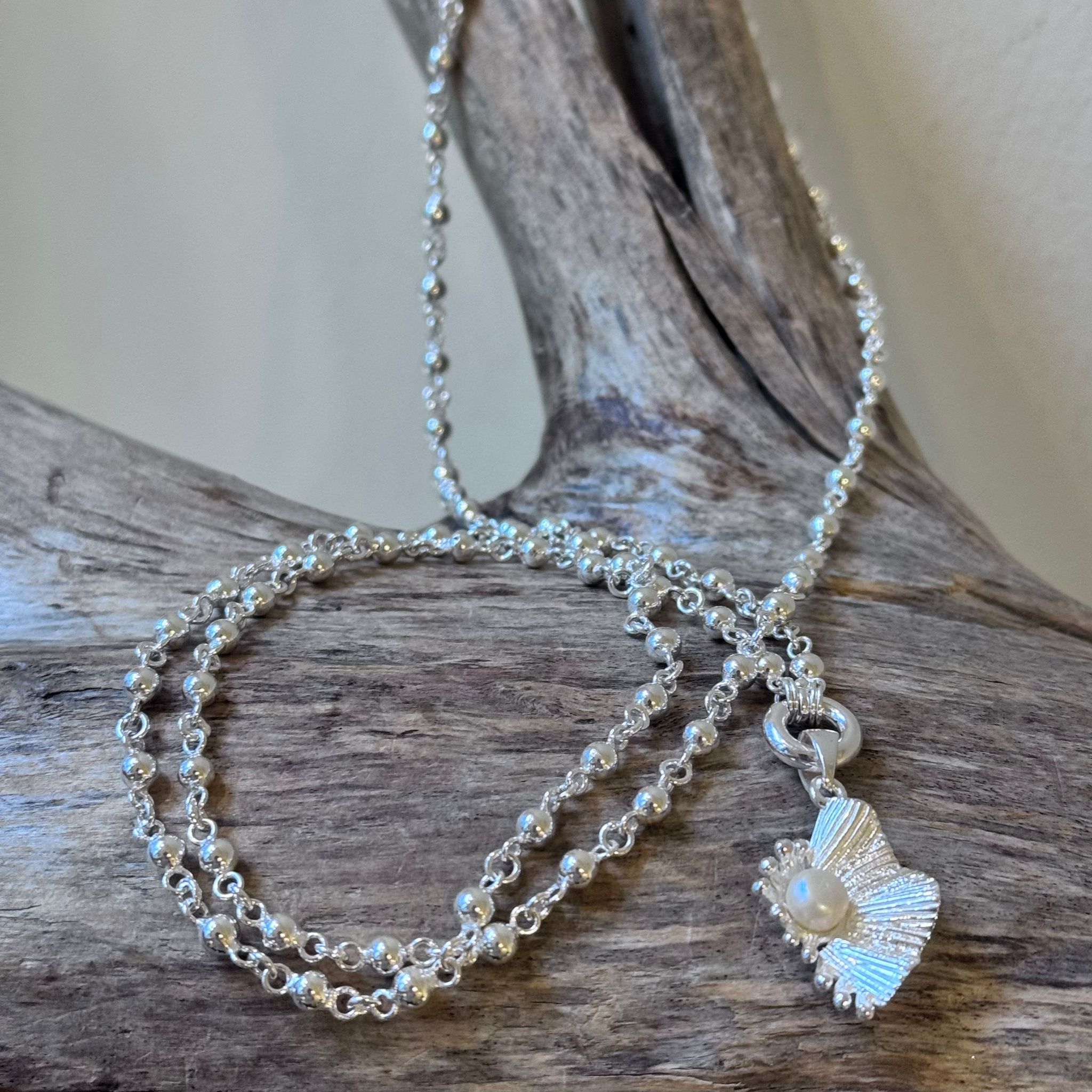 Schöne lange Kette aus Sterlingsilber (3mm). Die Kette hat eine Länge von 89,5cm und kann, zweimal um den Hals gewickelt auch als kurze Kette getragen werden. Der dekorative Anhänger aus Sterlingsilber mit einer Süsswasserperle hat die Masse von 3,2x2,7cm.