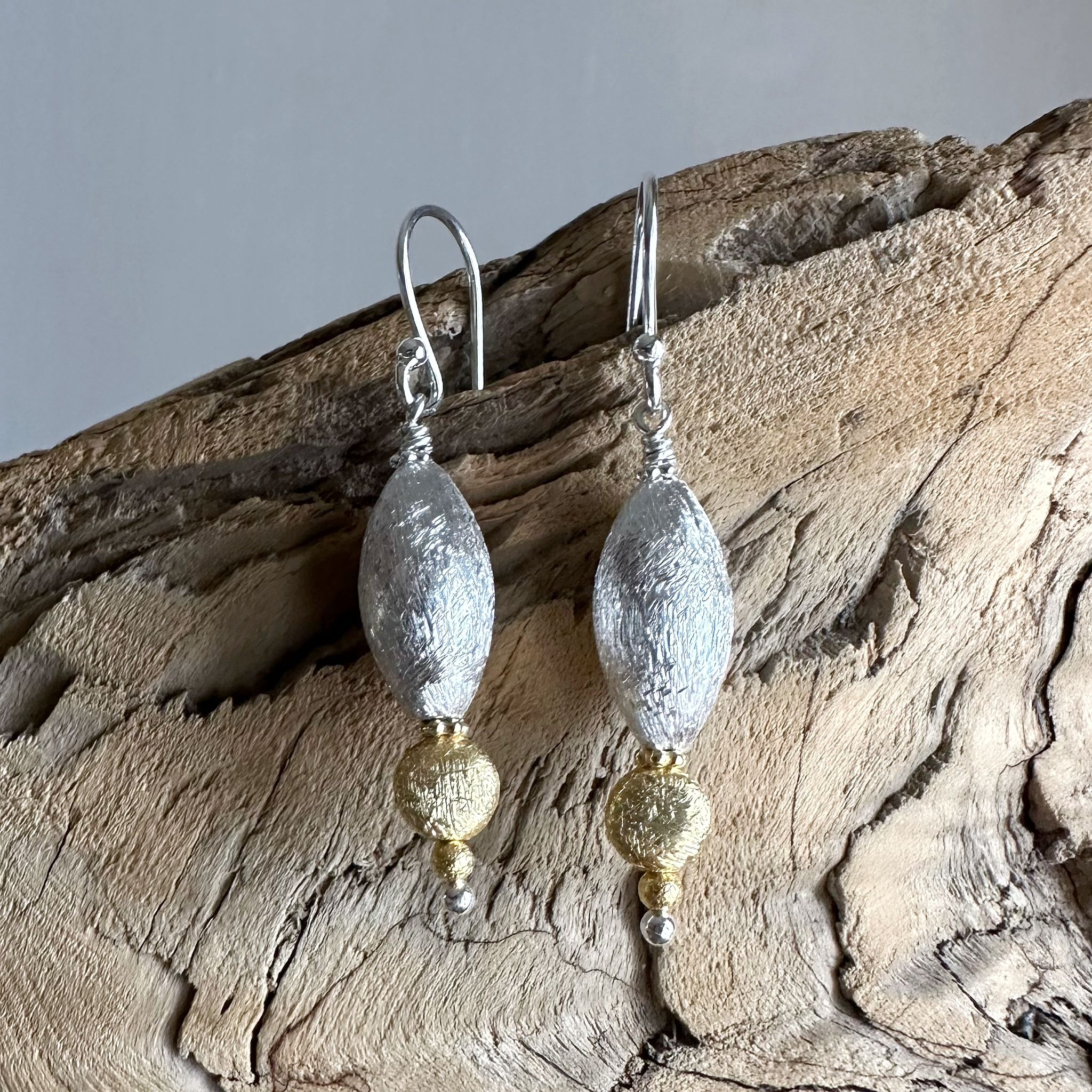 Diese schönen Ohrhänger haben wir aus Elementen aus mattiertem Sterlingsilber (15x7mm) und münzförmigen Elementen aus vergoldetem mattiertem Sterlingsilber (6mm) kreiert. Die Ohrhänger haben eine Länge von 4,5cm.