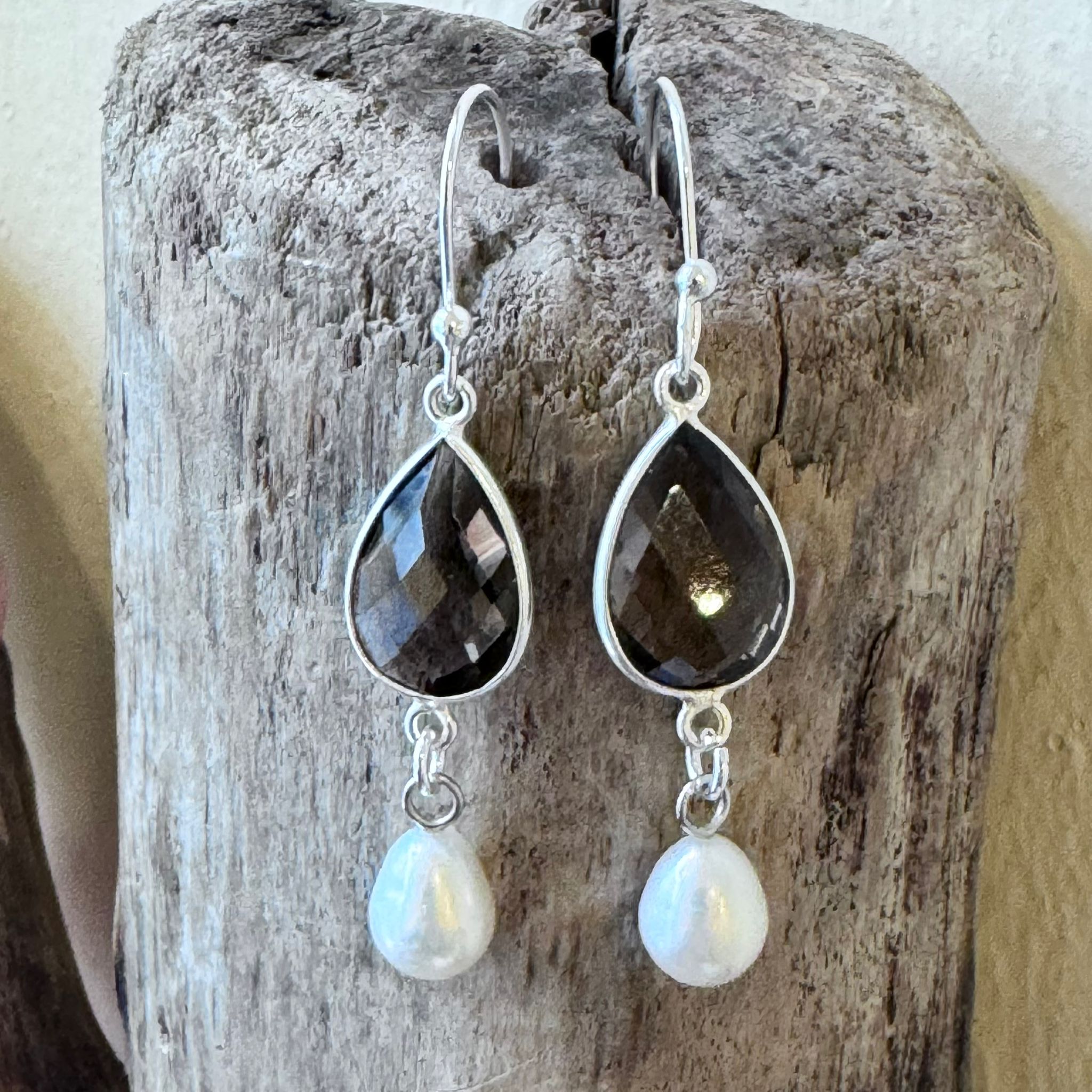 Ohrhänger facettierter Rauchquarz, Süsswasserperlen und Sterlingsilber