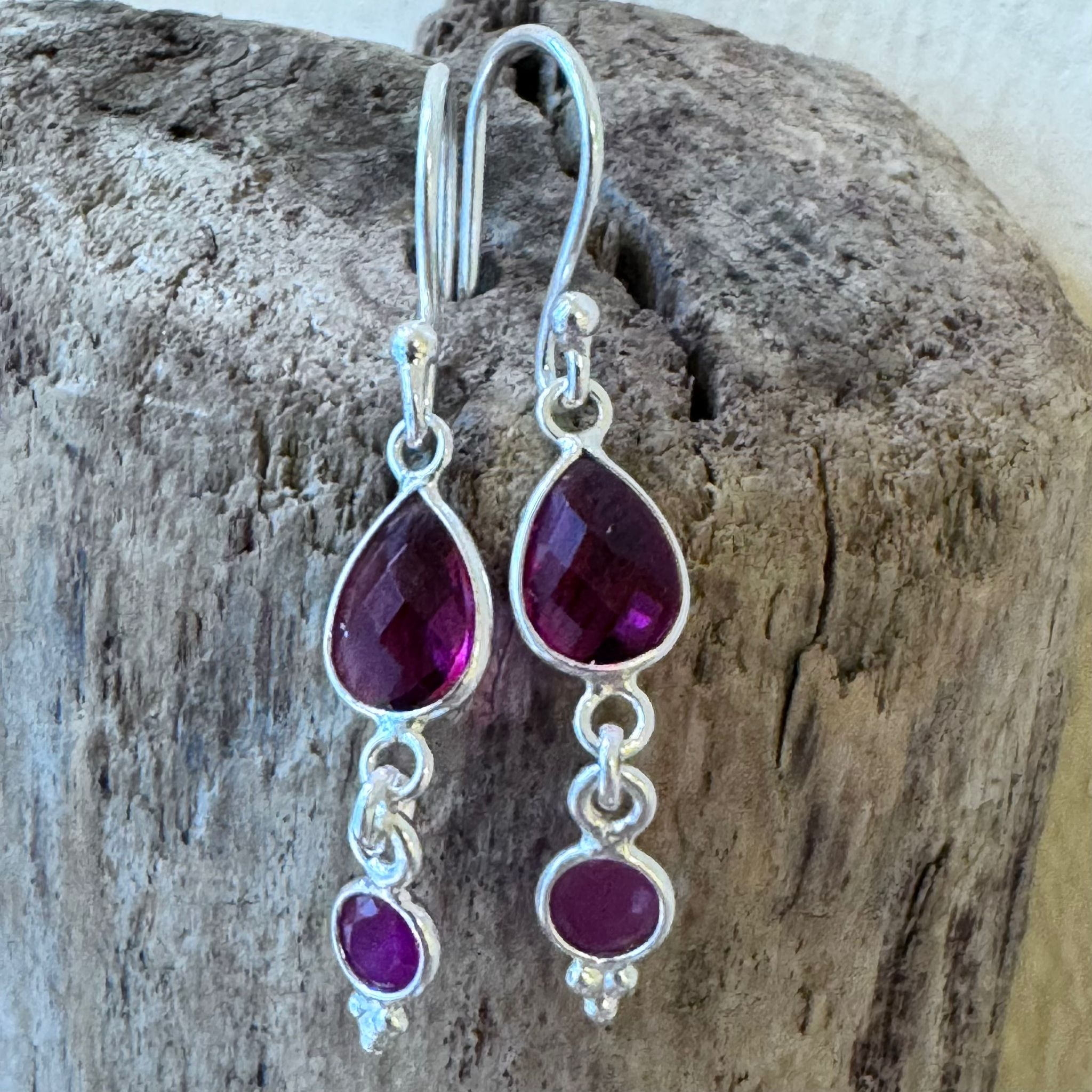 Diese schönen Ohrhänger haben wir aus tropfenförmigem facettiertem Rubin (10x7mm) und Charms aus facettiertem Rubin (5mm) kreiert. Die Ohrhänger haben eine Länge von 3,8cm.