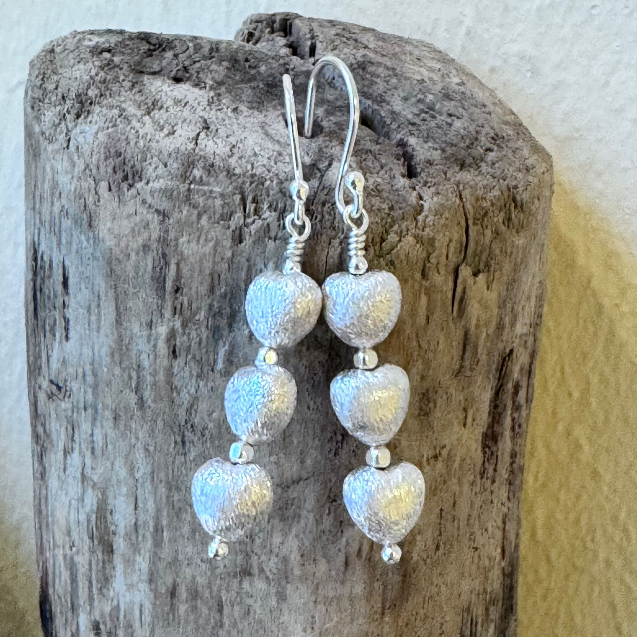 Diese schönen Ohrhänger haben wir aus Herzen aus mattiertem Sterlingsilber (6x7mm) und Zwischenstücken aus Sterlingsilber kreiert. Die Ohrhänger haben eine Länge von 4,6cm.