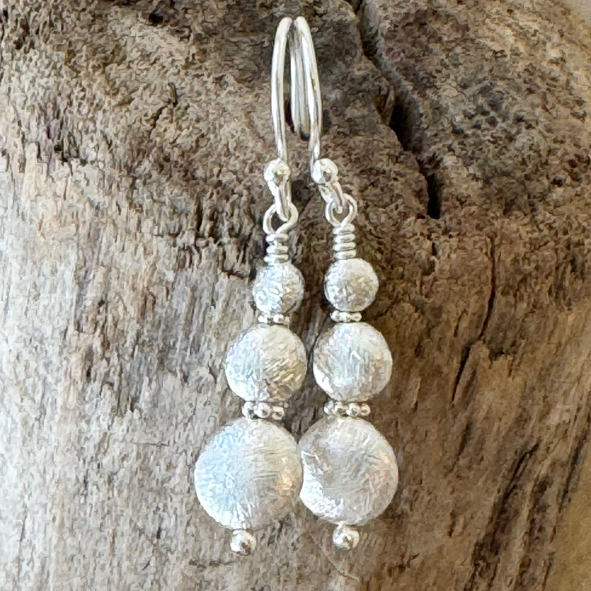 Diese schönen Ohrhänger haben wir aus münzförmigen Elementen aus mattiertem Sterlingsilber (3mm, 5mm und 8mm) kreiert. Die Ohrhänger haben eine Länge von 3,8cm.