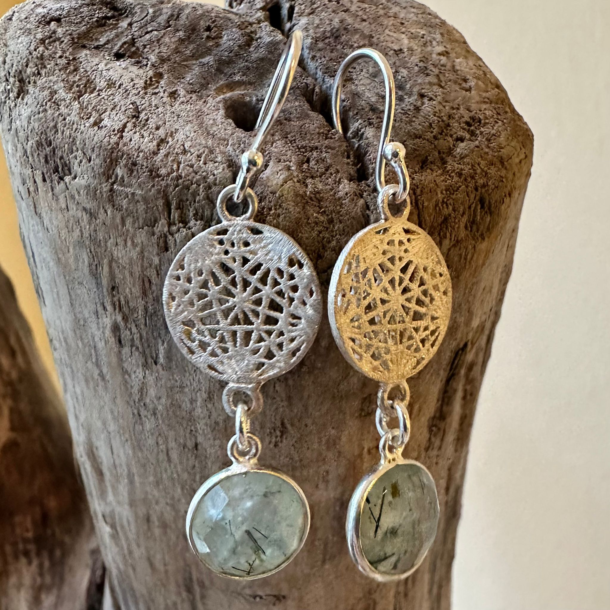 Diese schönen Ohrhänger haben wir aus Elementen aus mattiertem Sterlingsilber (15mm) und facettiertem grünem Rutilquarz (11mm) kreiert. Die Ohrhänger haben eine Länge von 4,8cm.