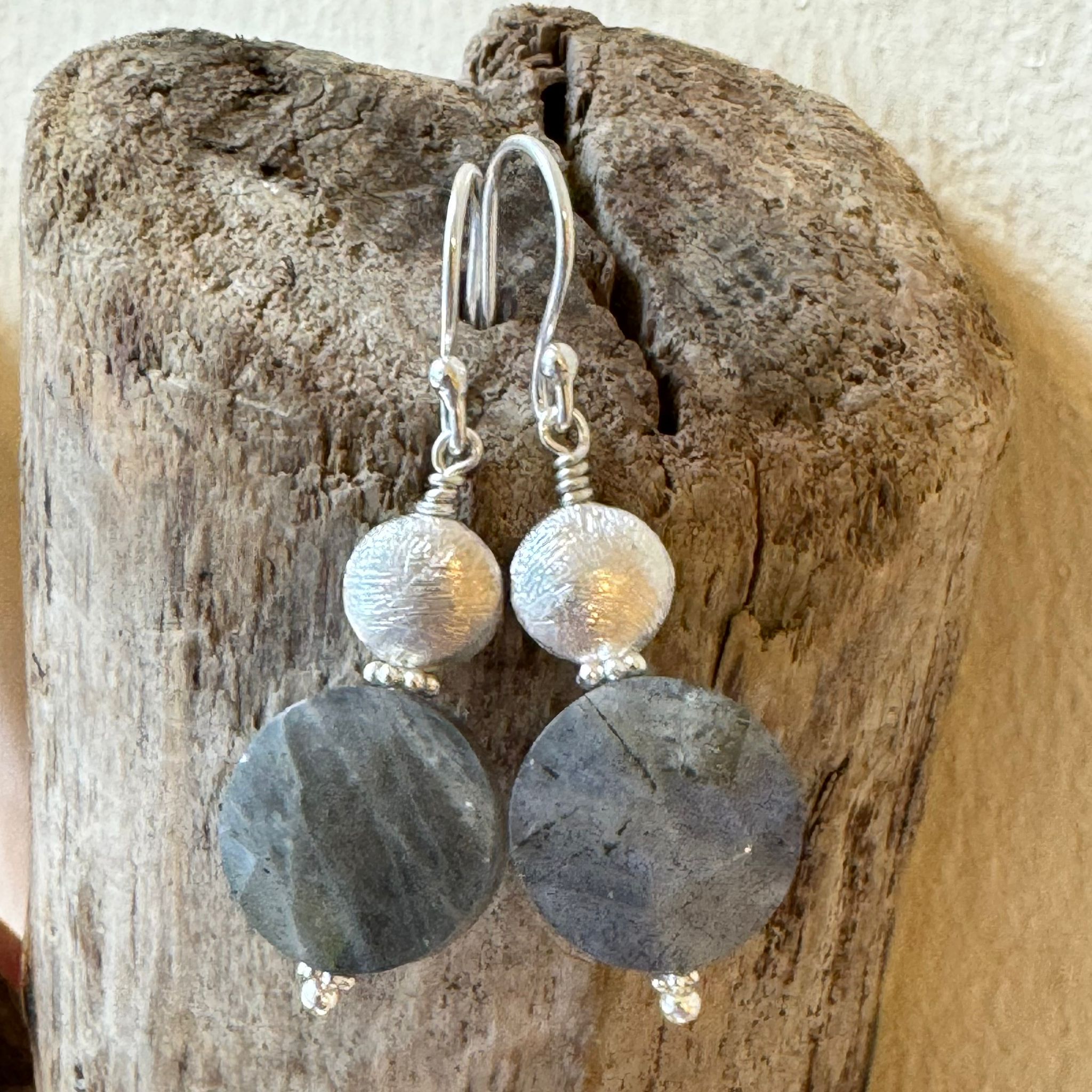 Diese schönen Ohrhänger haben wir aus münzförmigen Elementen aus mattiertem Sterlingsilber (7mm) und münzförmigem facettiertem Labradorit (15mm) kreiert. Die Ohrhänger haben eine Länge von 4,2cm.
