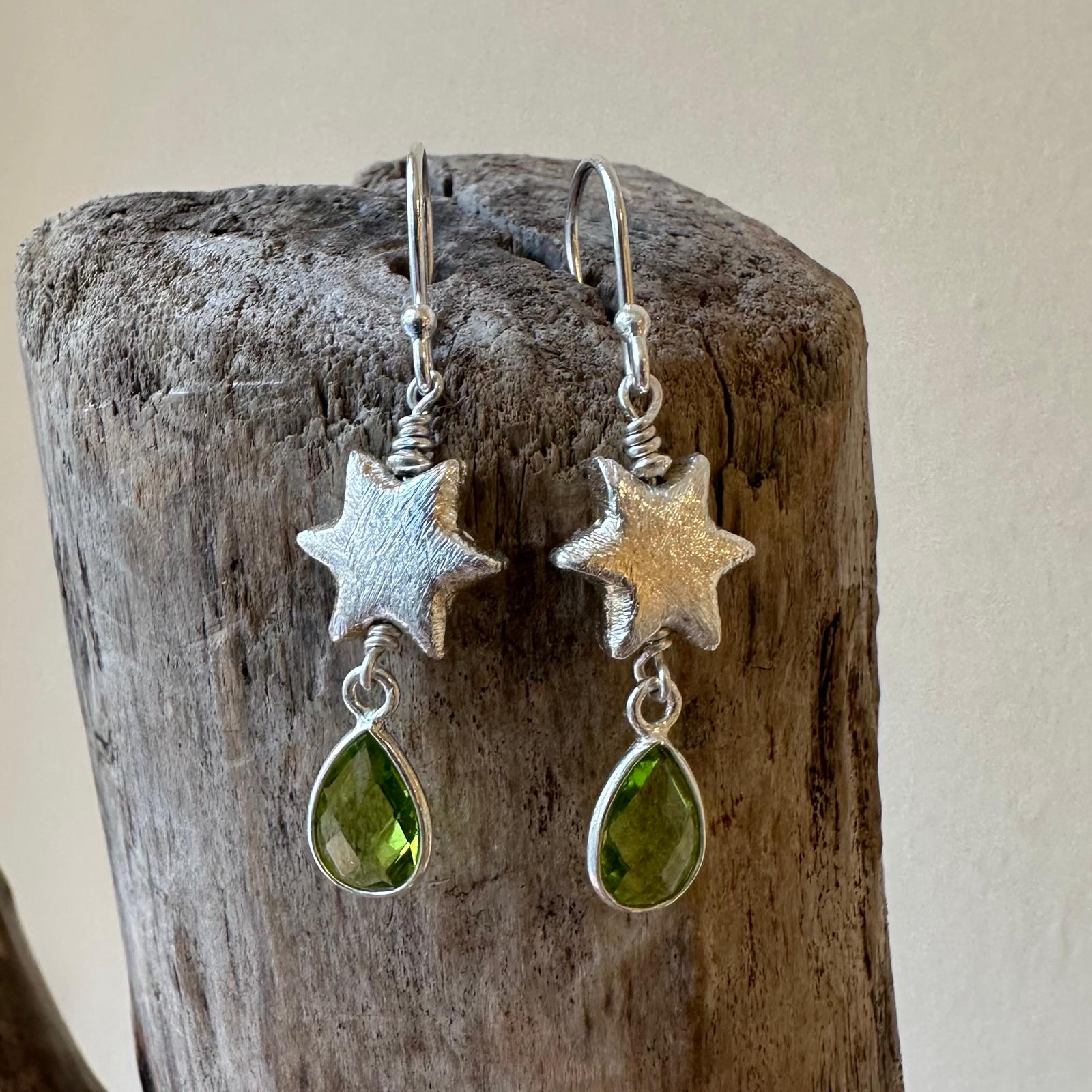 Diese schönen Ohrhänger haben wir aus sternenförmigen Elementen aus mattiertem Sterlingsilber (12mm) und facettiertem Peridot in Tropfenform (10x7mm) kreiert. Die Ohrhänger haben eine Länge von 4,4cm.