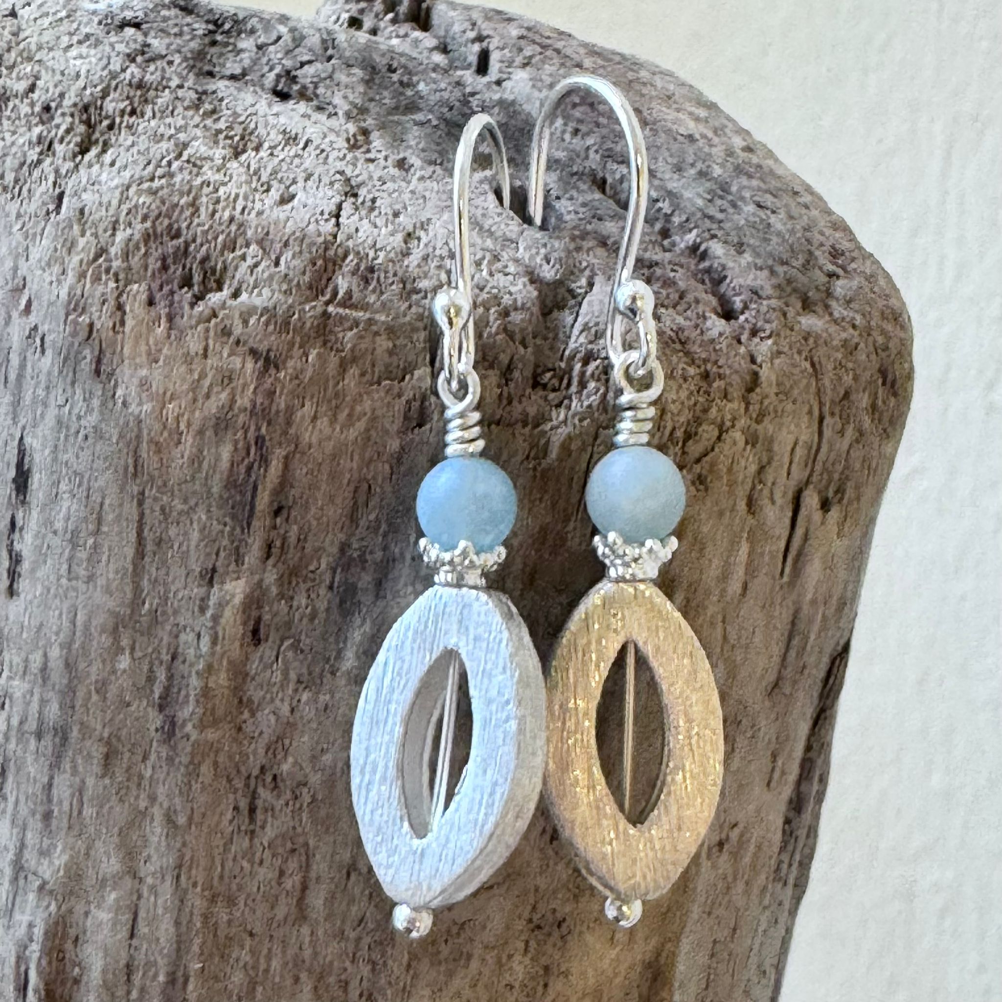 Diese schönen Ohrhänger haben wir aus Elementen aus mattiertem Sterlingsilber (16x10mm) und Kugeln aus mattiertem Aquamarin (5mm) kreiert. Die Ohrhänger haben eine Länge von 4cm.
