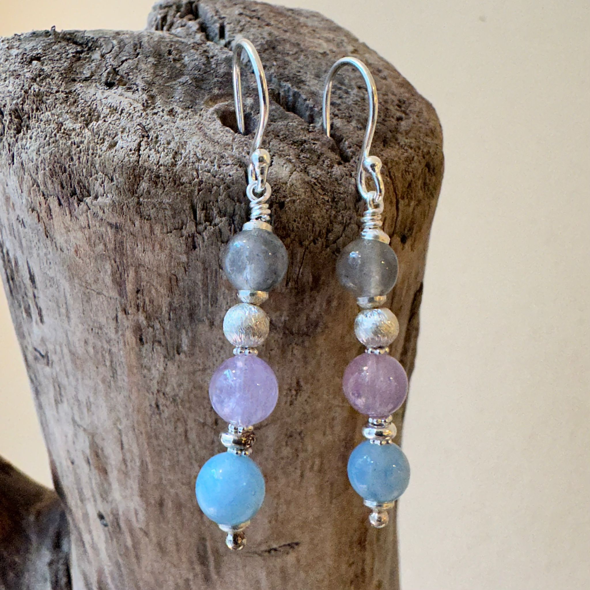Diese schönen Ohrhänger haben wir aus poliertem Labradorit, Kunzit, Amazonit (6mm) und Zwischenstücken aus Sterlingsilber kreiert. Die Ohrhänger haben eine Länge von 4,9cm.
