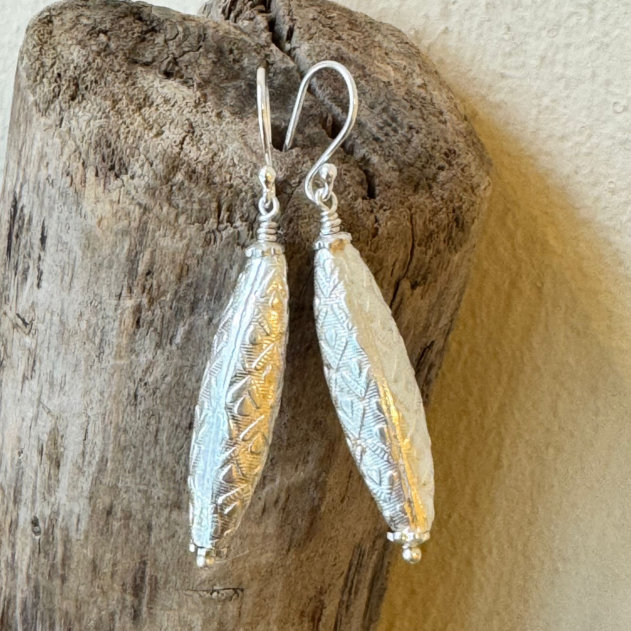 Diese schönen Ohrhänger haben wir aus Elementen aus Sterlingsilber (35x10mm) kreiert. Die Ohrhänger haben eine Länge von 5,3cm.