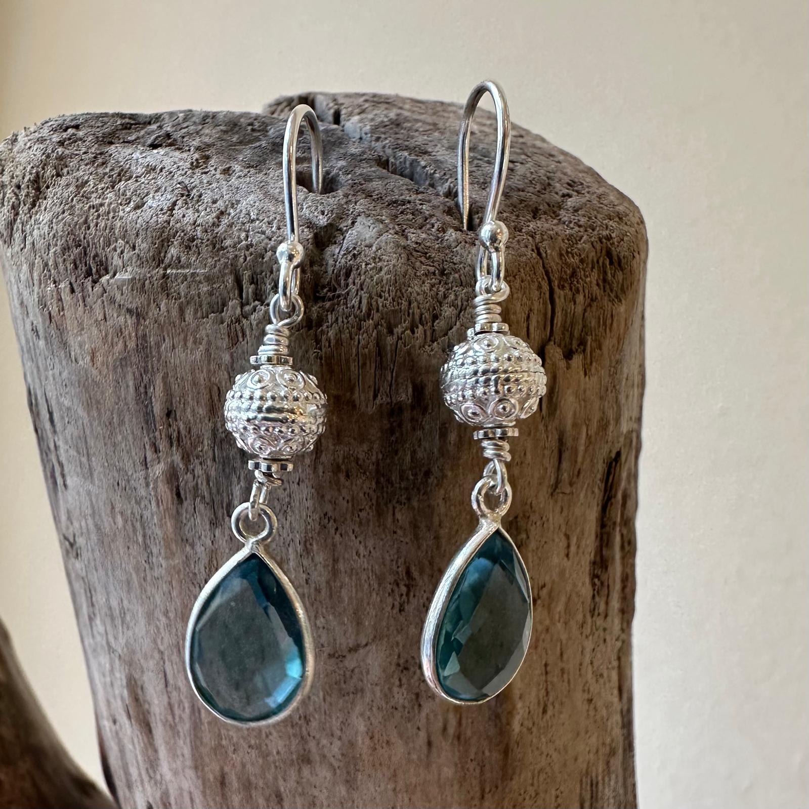 Diese schönen Ohrhänger haben wir aus dekorativen Kugeln aus Sterlingsilber (7mm) und facettiertem London Topas in Tropfenform (13x9mm) kreiert. Die Ohrhänger haben eine Länge von 4,4cm.