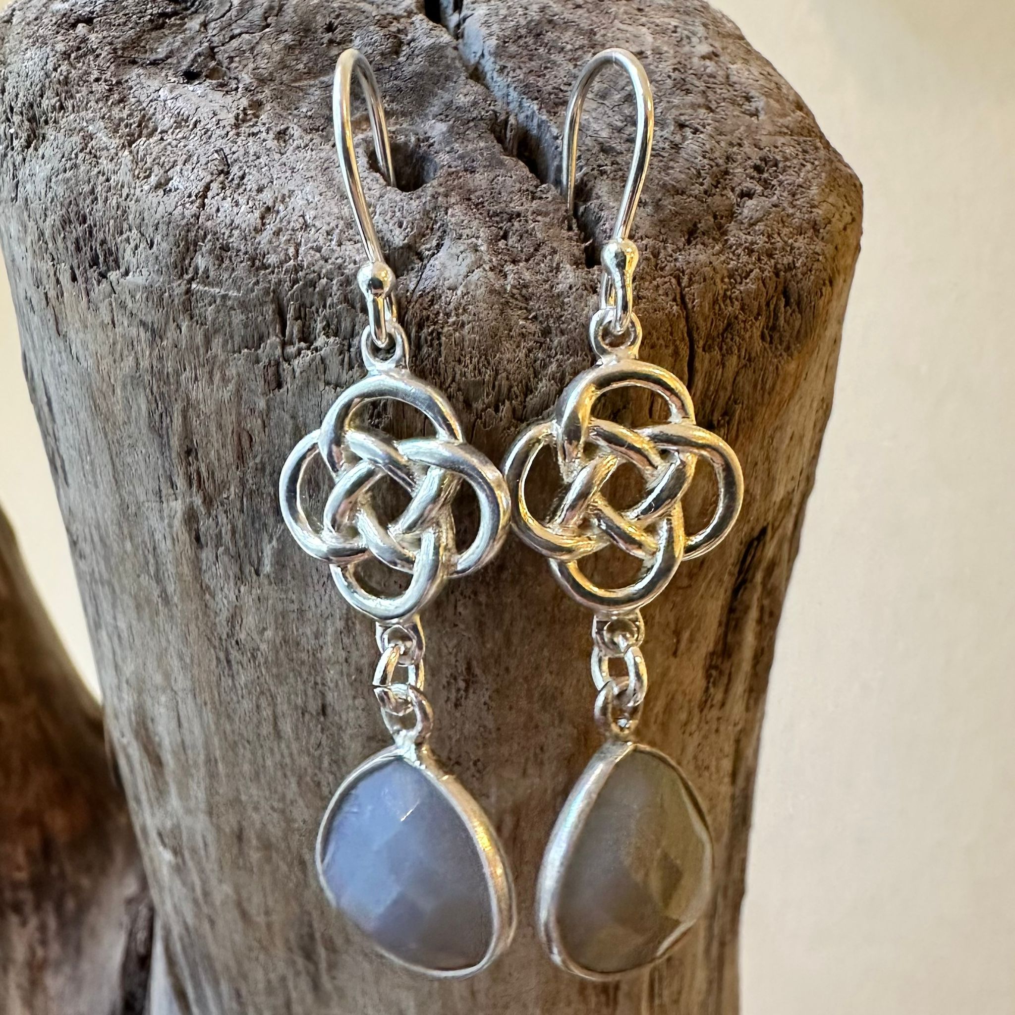 Diese schönen Ohrhänger haben wir aus Elementen "keltischer Knoten" aus Sterlingsilber (13mm) und facettiertem grauem Chalcedon in Tropfenform (14mm) kreiert. Die Ohrhänger haben eine Länge von 5cm.
