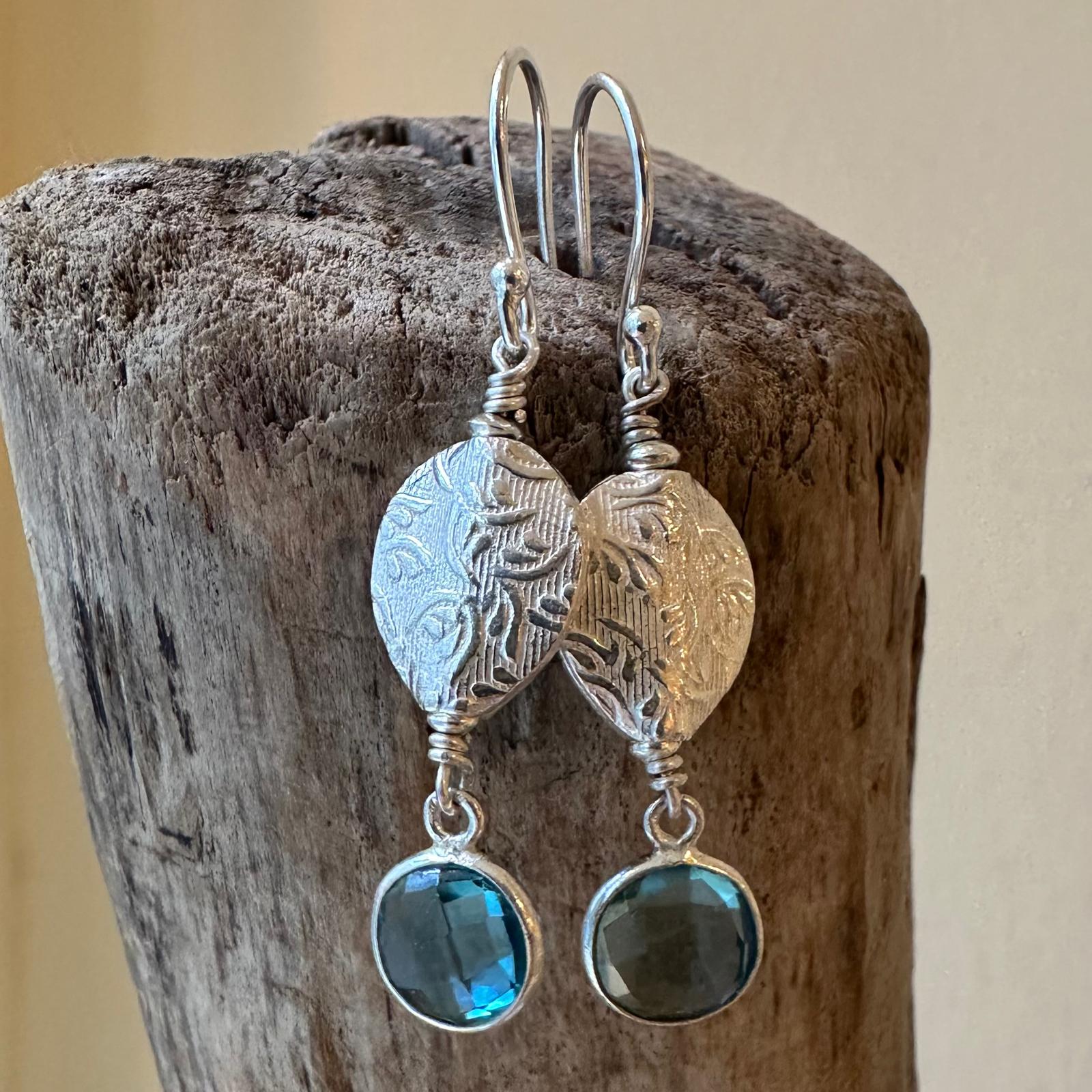 Diese schönen Ohrhänger haben wir aus Elementen aus Sterlingsilber (13x11mm) und facettiertem London Topas (8mm) kreiert. Die Ohrhänger haben eine Länge von 4,8cm.