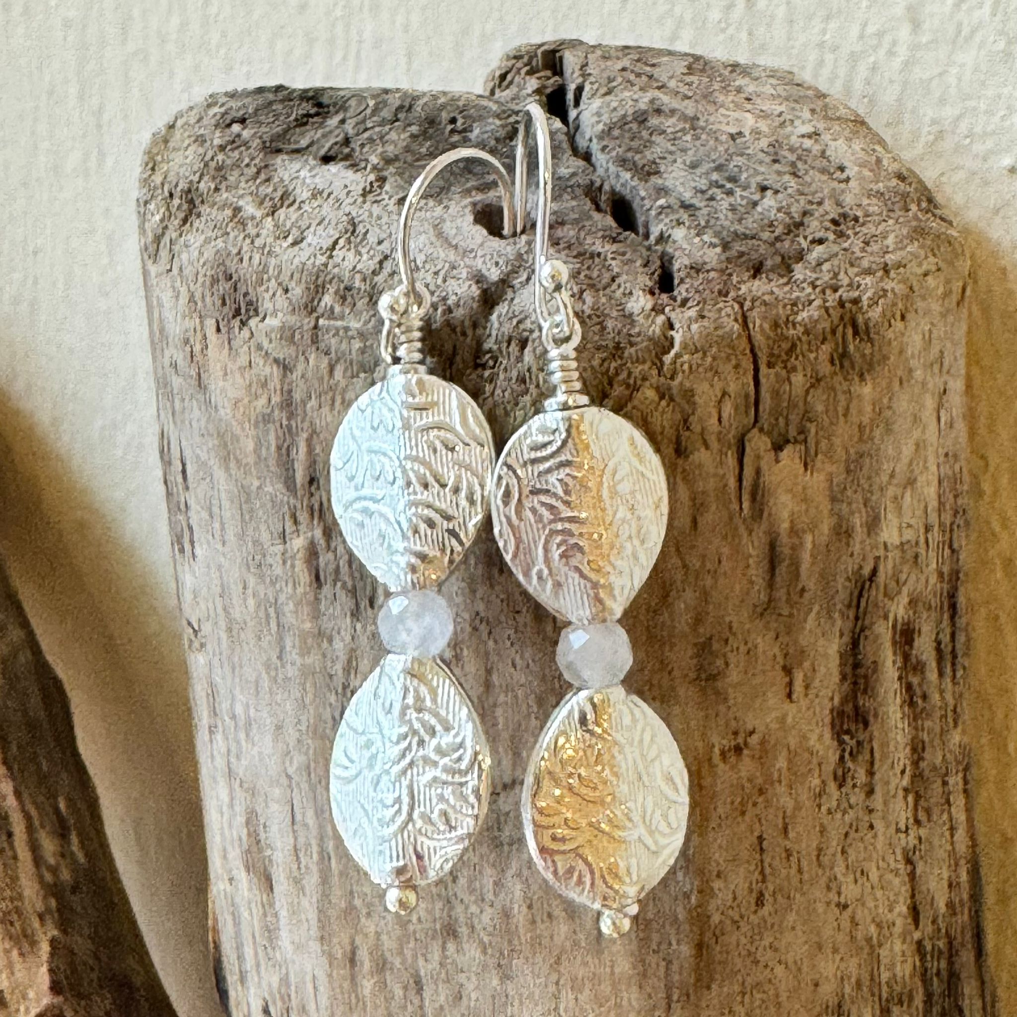 Diese schönen Ohrhänger haben wir aus Elementen aus Sterlingsilber (9x10mm) und facettiertem Regenbogen-Mondstein (3,5x4mm) kreiert. Die Ohrhänger haben eine Länge von 5cm.