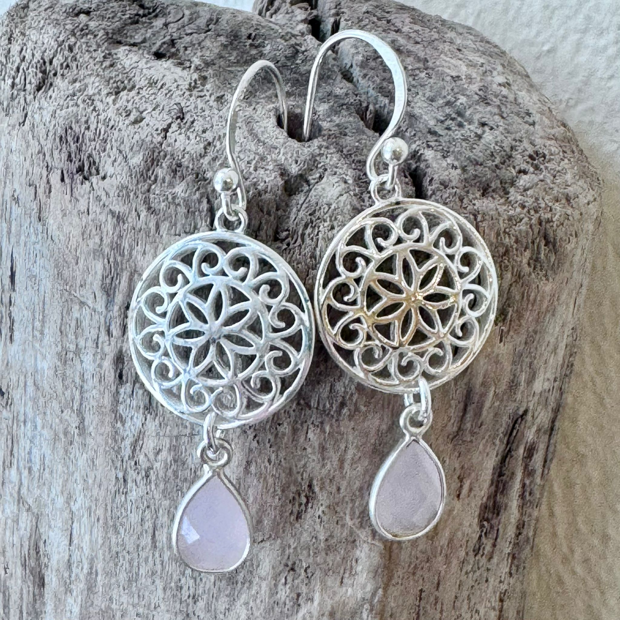 Diese schönen Ohrhänger haben wir aus Elementen aus Sterlingsilber (15mm) und tropfenförmigem facettiertem rosa Chalcedon (10x6mm) kreiert. Die Ohrhänger haben eine Länge von 4,2cm.