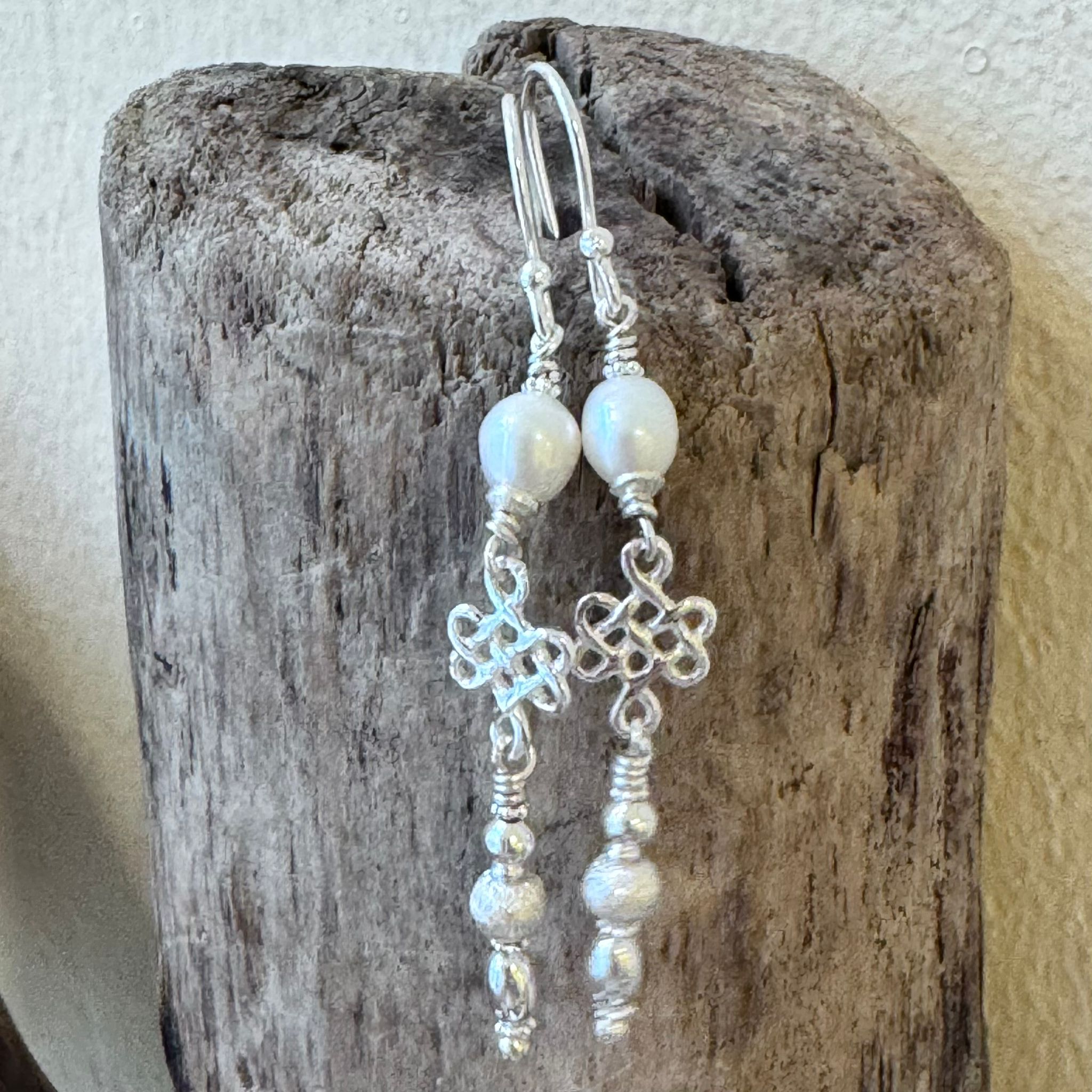 Diese schönen Ohrhänger haben wir aus Süsswasserperlen (5mm), Elementen "keltischer Knoten" aus Sterlingsilber (12x8mm) und Zwischenstücken aus poliertem und mattiertem Sterlingsilber (3-4mm) kreiert. Die Ohrhänger haben eine Länge von 6cm.