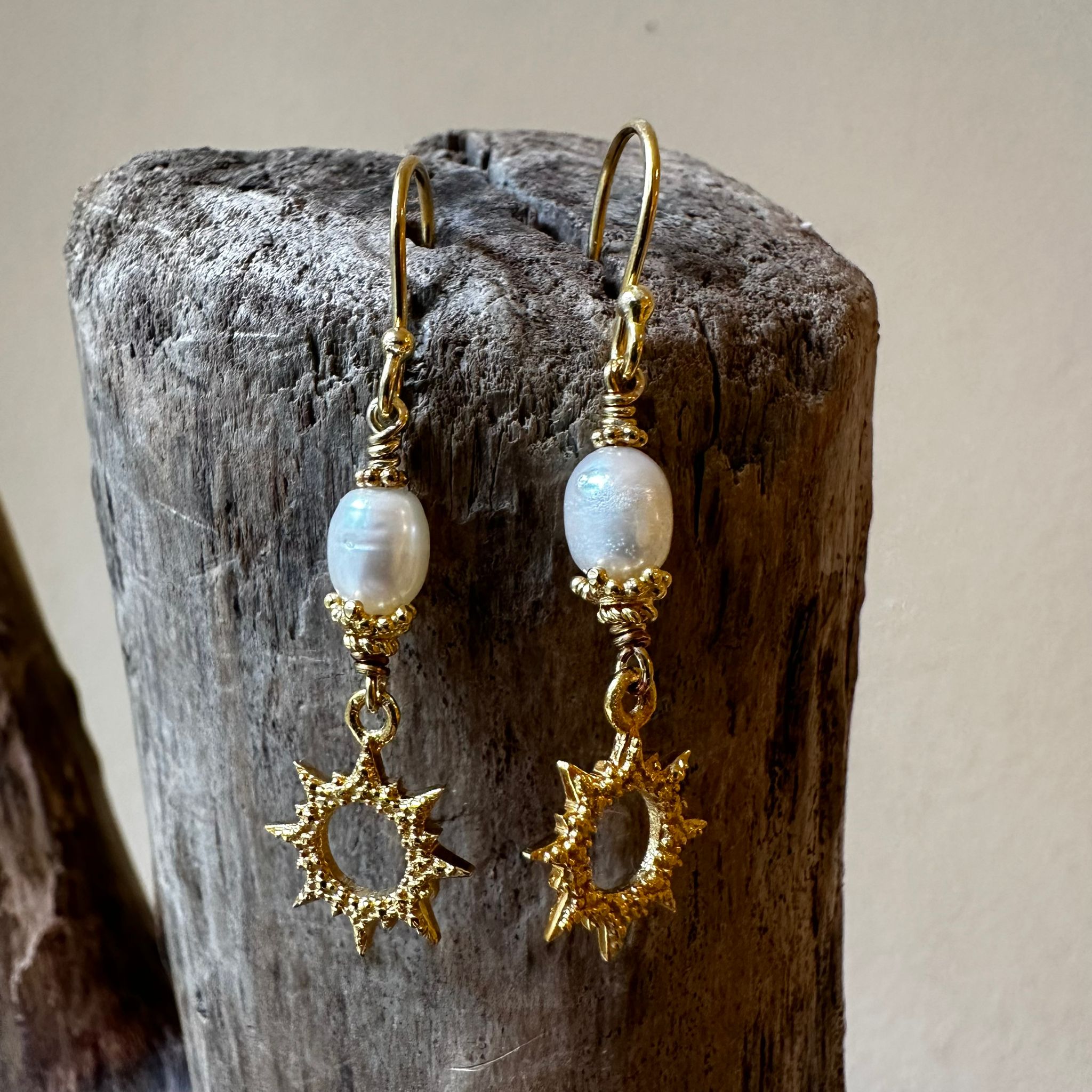 Diese schönen Ohrhänger haben wir aus Süsswasserperlen (7x5mm) und Stern-Charms aus vergoldetem Sterlingsilber (13mm) kreiert. Die Ohrhänger haben eine Länge von 4,1cm.