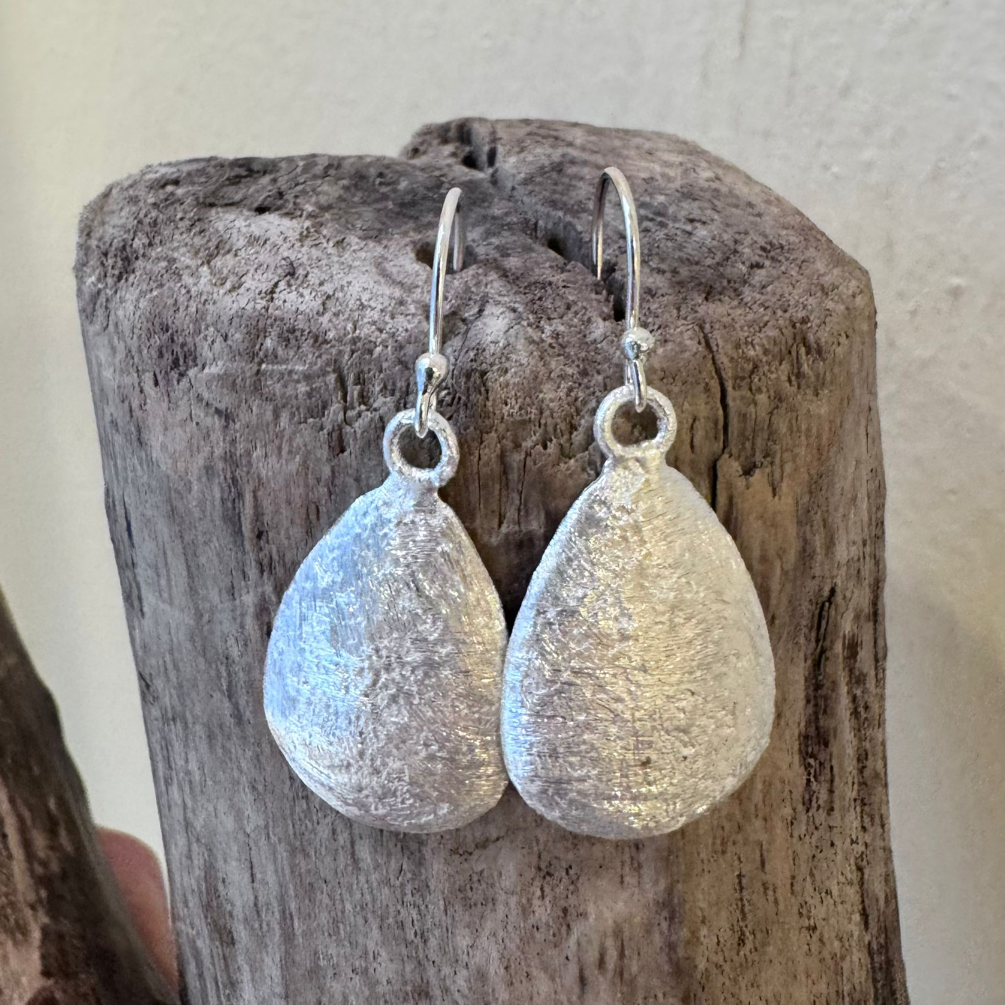 Diese schönen Ohrhänger haben wir aus Tropfen-Elementen aus mattiertem Sterlingsilber (28x17mm) kreiert. Die Ohrhänger haben eine Länge von 3,8cm.