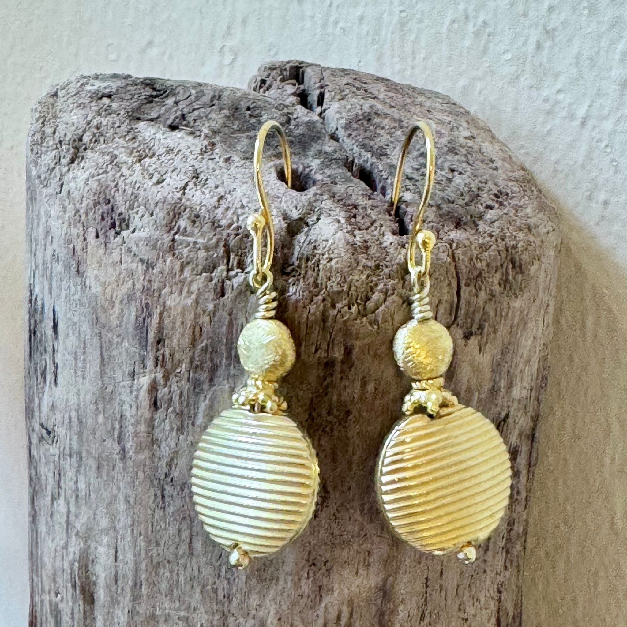Diese schönen Ohrhänger haben wir aus münzförmigen Elementen aus mattiertem Sterlingsilber (6mm) und münzförmigen Elementen aus poliertem/mattiertem vergoldetem Sterlingsilber (15mm) kreiert. Die Ohrhänger haben eine Länge von 4,2cm.