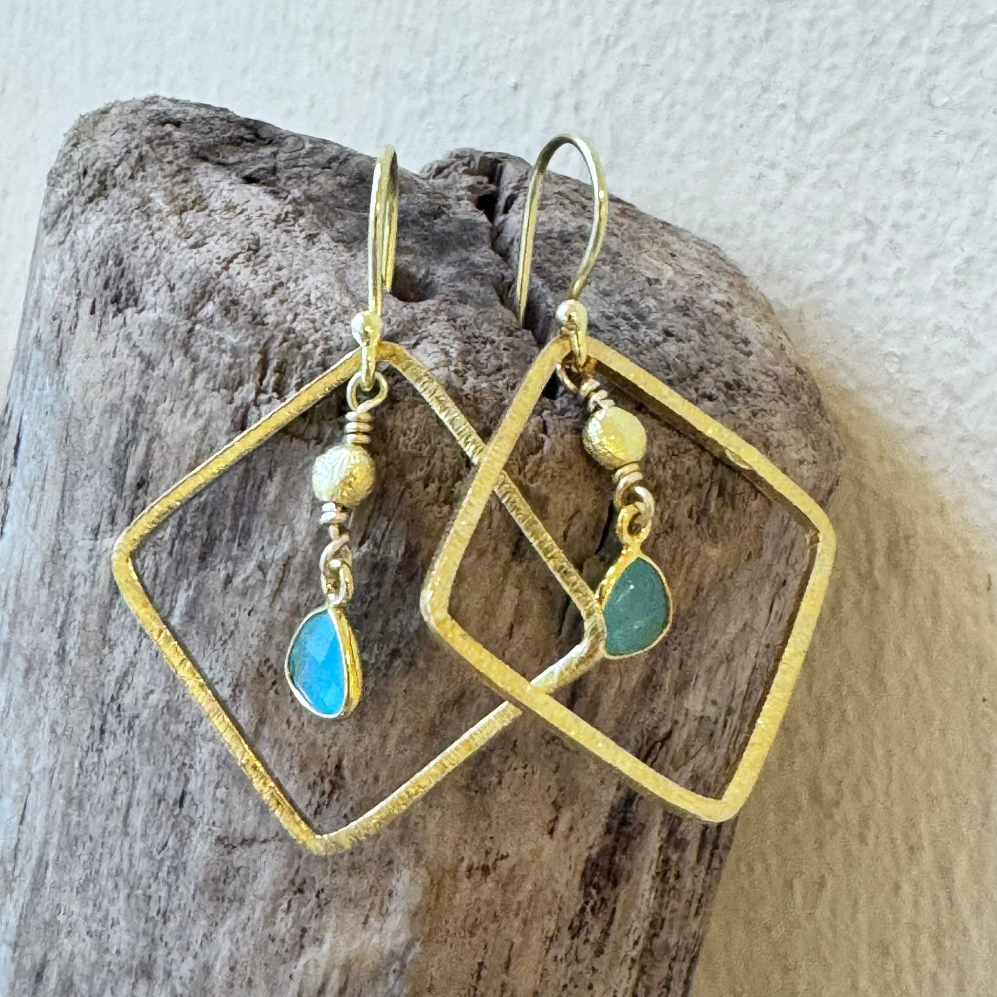 Diese schönen Ohrhänger haben wir aus Elementen aus mattiertem vergoldetem Sterlingsilber (30mm), münzförmigen Elementen aus mattiertem vergoldetem Sterlingsilber (3,5mm) und Charms aus facettiertem Apatit (10x6mm) kreiert. Die Ohrhänger haben eine Länge von 4cm.