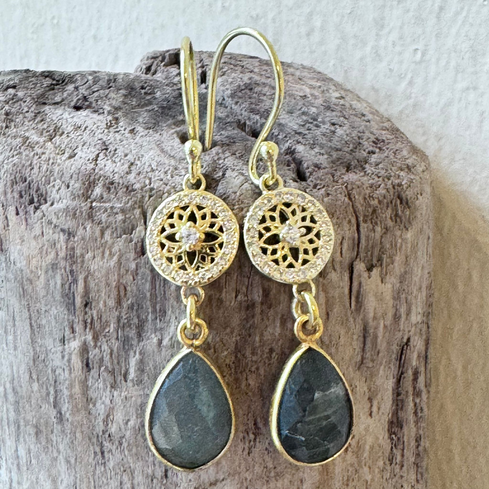 Diese schönen Ohrhänger haben wir aus Verbindungselementen aus vergoldetem Sterlingsilber mit Zirkonias (9mm) und facettiertem Labradorit in Tropfenform (15x9mm) kreiert. Die Ohrhänger haben eine Länge von 4,4cm.