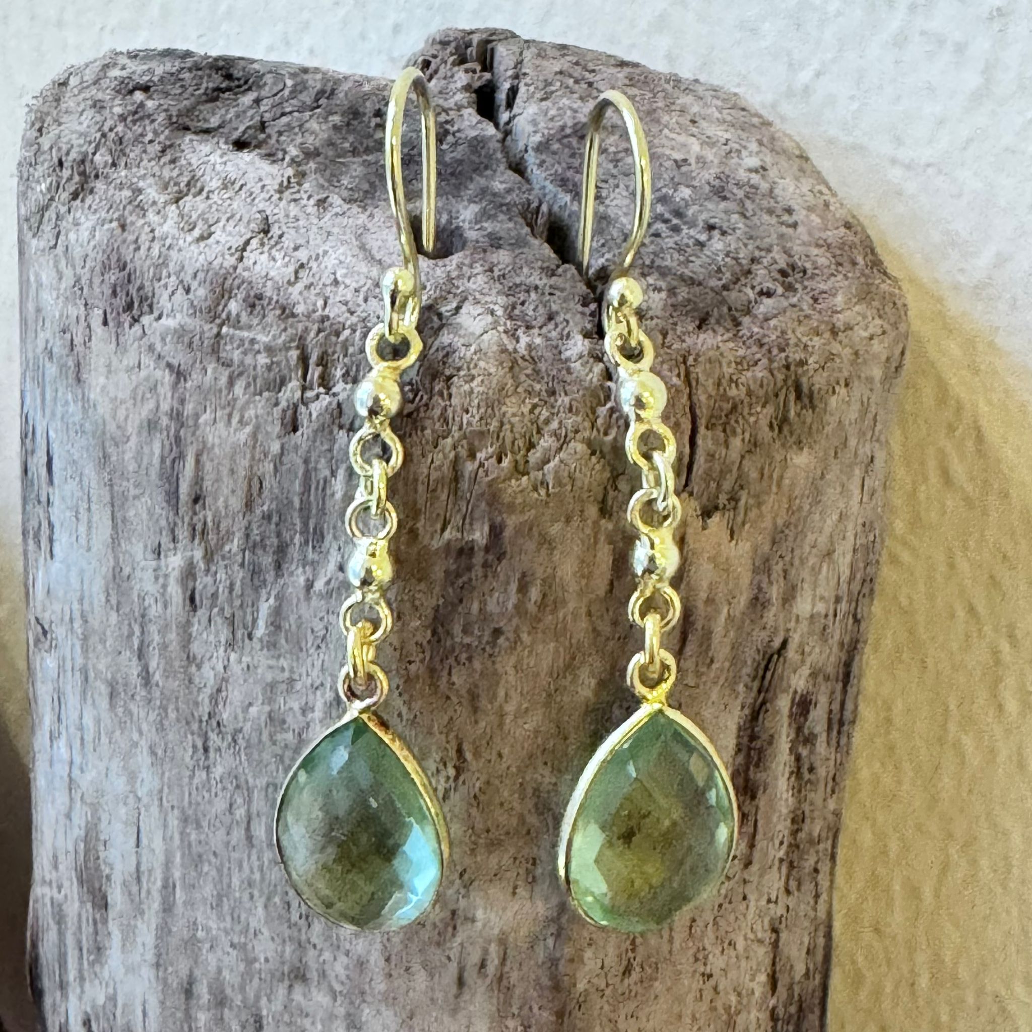 Diese schönen Ohrhänger haben wir aus Kettengliedern aus vergoldetem Sterlingsilber (3mm) und facettiertem Prasiolith in Tropfenform (17x11mm) kreiert. Die Ohrhänger haben eine Länge von 5cm.