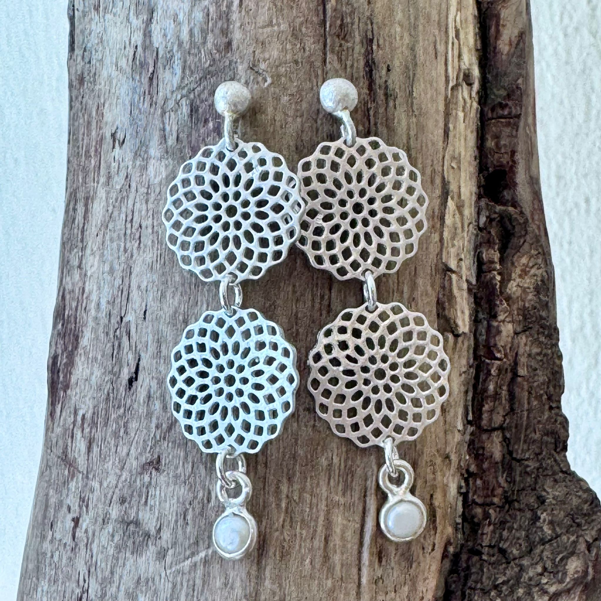 Diese schönen Ohrstecker haben wir aus Mandala-Elementen aus mattiertem Sterlingsilber (15mm) und Süsswasserperlen (5mm) kreiert. Die Ohrstecker haben eine Länge von 4,5cm.