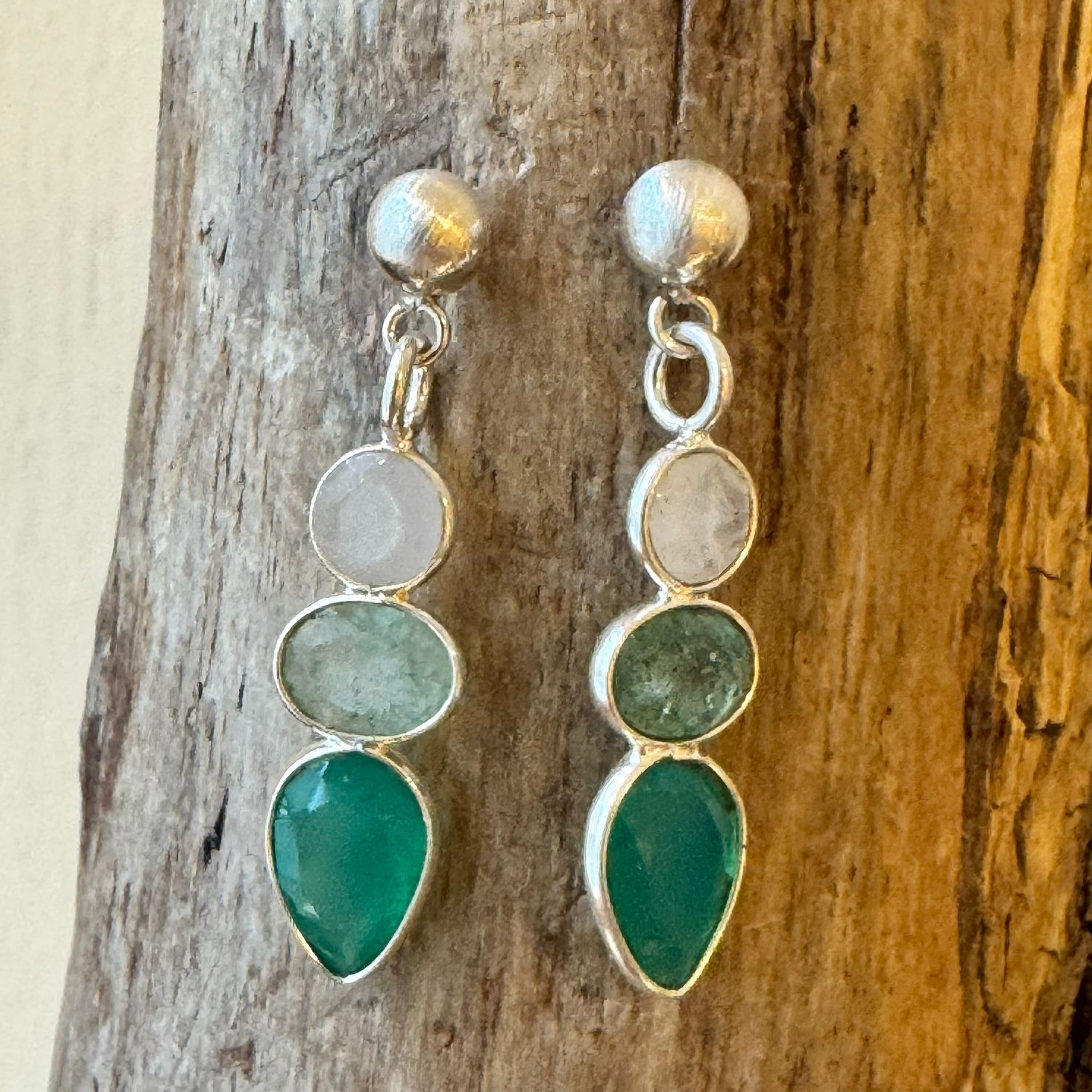 Diese schönen Ohrstecker haben wir aus mattiertem Sterlingsilber (5mm), facettiertem Regenbogen-Mondstein (6mm), facettiertem Prehnit (5x7mm) und facettiertem grünem Chalcedon (10x7mm) kreiert. Die Ohrstecker haben eine Länge von 3,4cm.