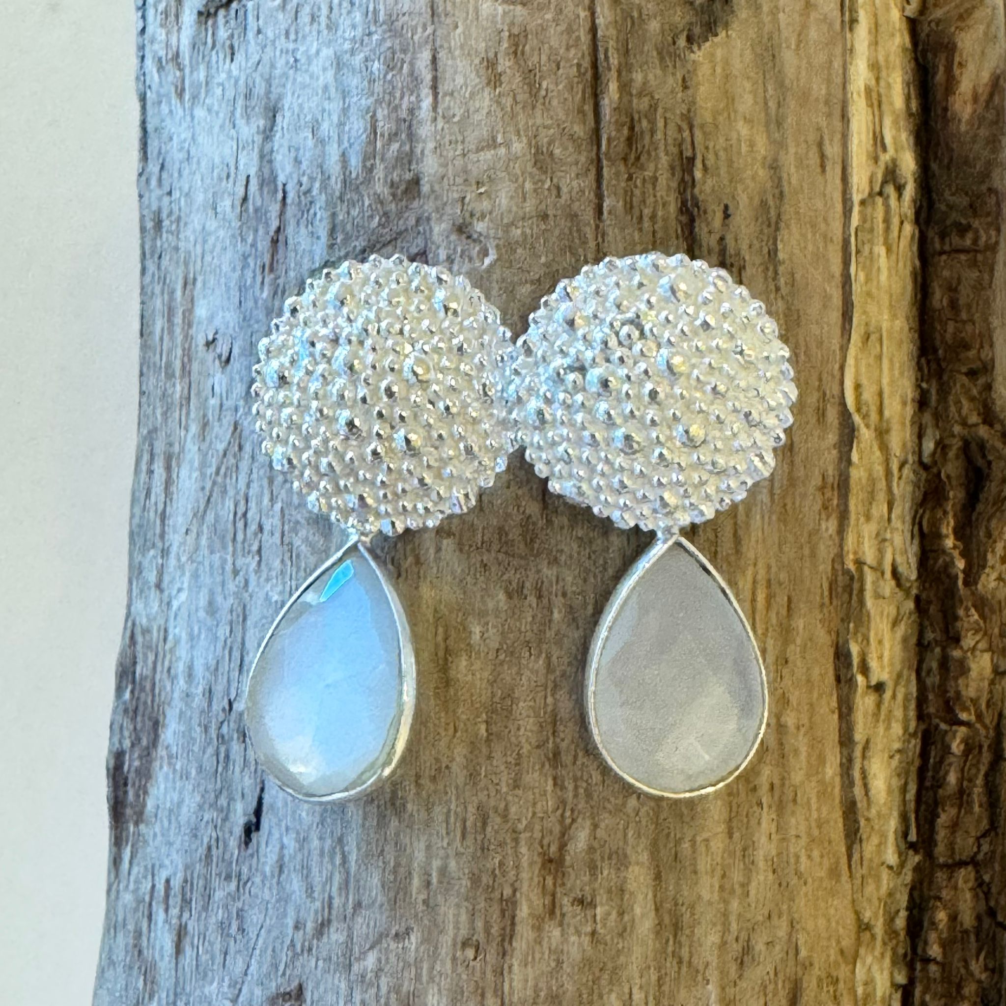Diese schönen Ohrstecker haben wir aus Sterlingsilber (14mm) und facettiertem hellgrauem Mondstein in Tropfenform (15x9mm) kreiert. Die Ohrstecker haben eine Länge von 2,5cm.