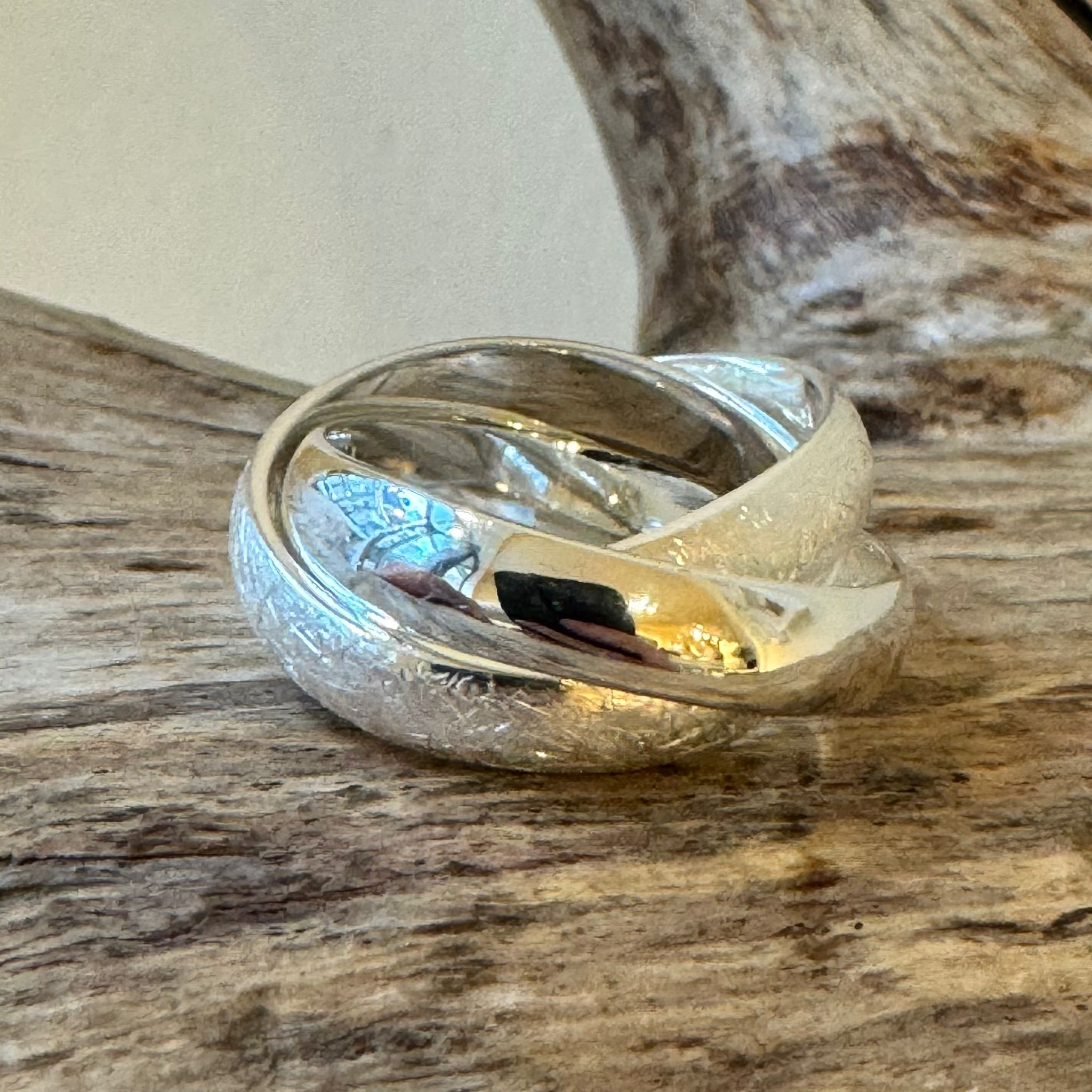 Sehr schöner 3-er Ring aus zwei Ringschienen aus mattiertem Sterlingsilber (4mm) und einer Ringschiene aus poliertem Sterlingsiber (4mm). Der Ring hat eine Breite von ca. 11mm.