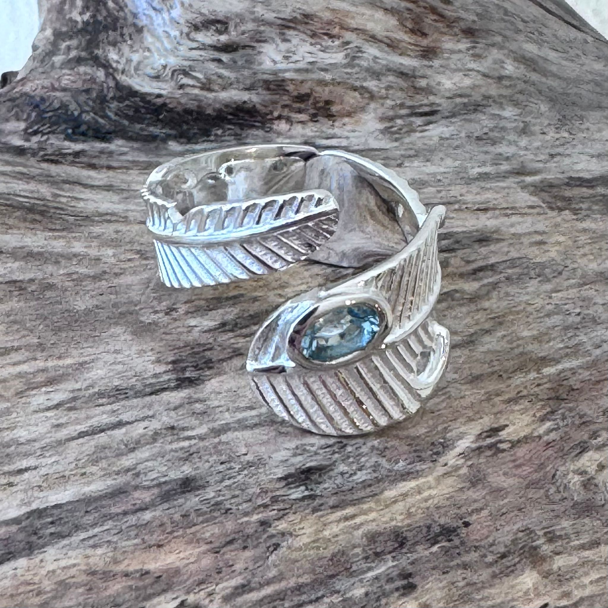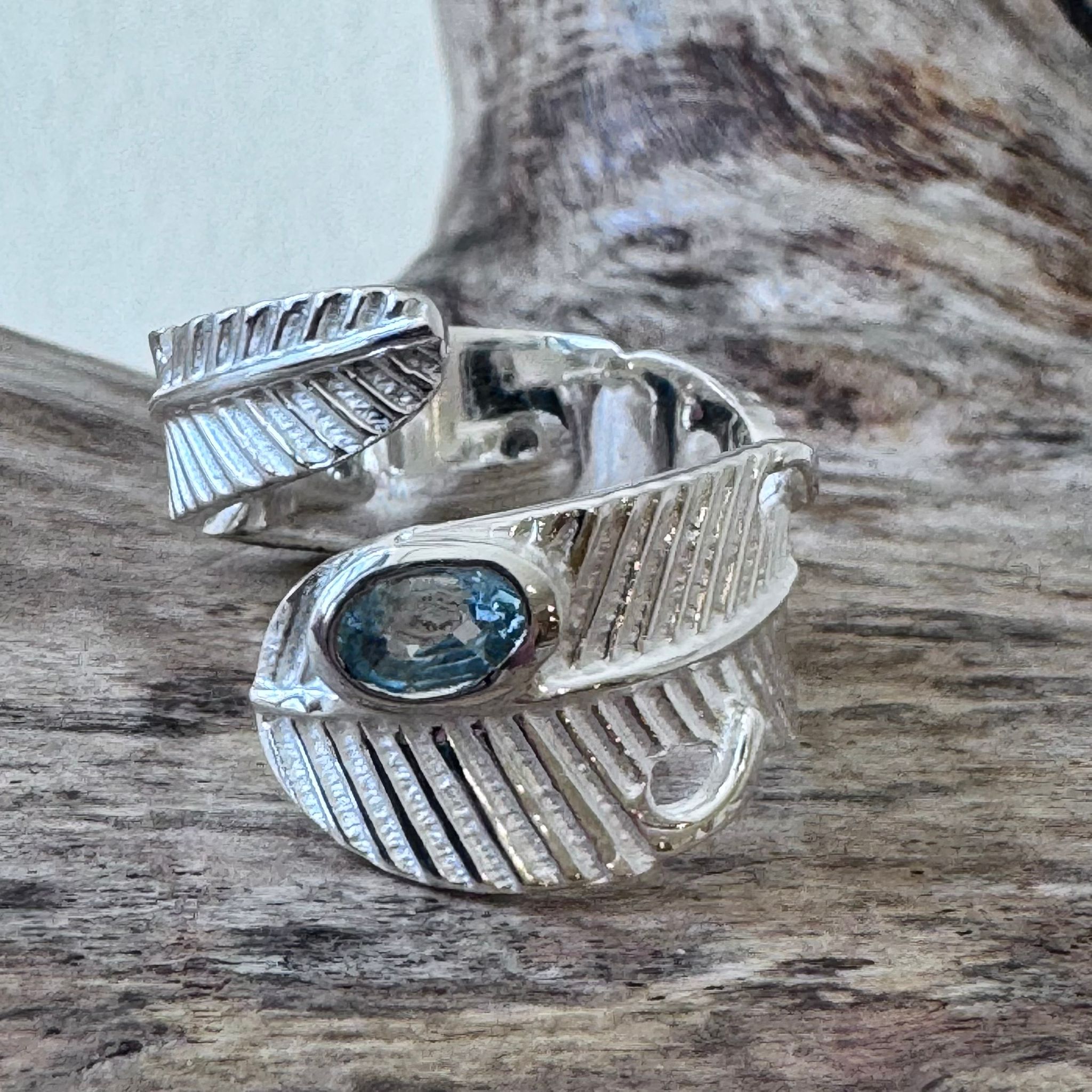 Ring "Feder" Sterlingsilber und facettierter hellblauer Topas